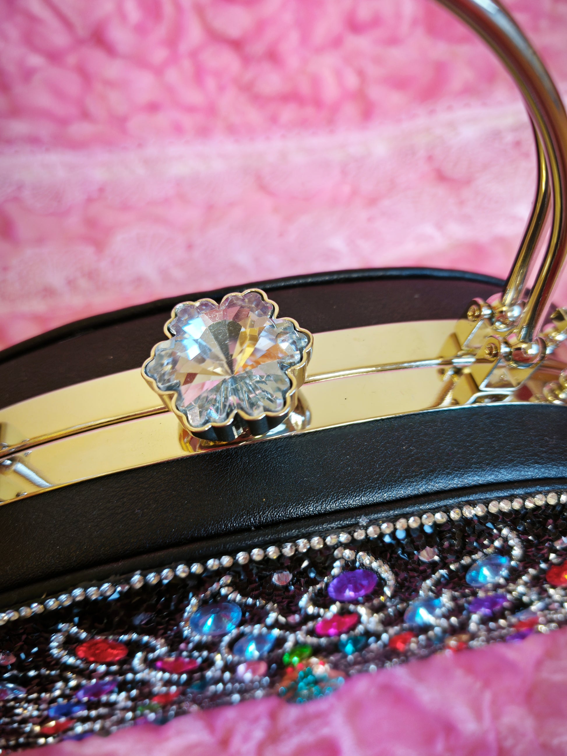 Crafted with high-quality diamond-setting technology and wear-resistant black leather base, the front features a cool and dazzling visual effect with full-paved black rhinestones and colorful diamond peacock pattern dense setting technology. The sides and back are made of black matte leather (smooth touch and scratch-resistant), and the metal edging and hand ring adopt electroplated bright silver technology for anti-oxidation and non-fading. The rhinestones are inlaid with firm hand dense setting technology, and the peacock pattern composed of black rhinestones and colorful diamonds is not easy to fall off. The leather base has both scratch-resistant and wear-resistant properties, which not only retains the luxurious and shiny texture of the clutch bag, but also can maintain a delicate shape for a long time after multiple uses.