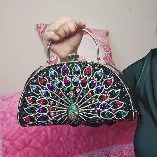 Black-Base Multi-Colored Crystal Peacock-Pattern Evening Handbag