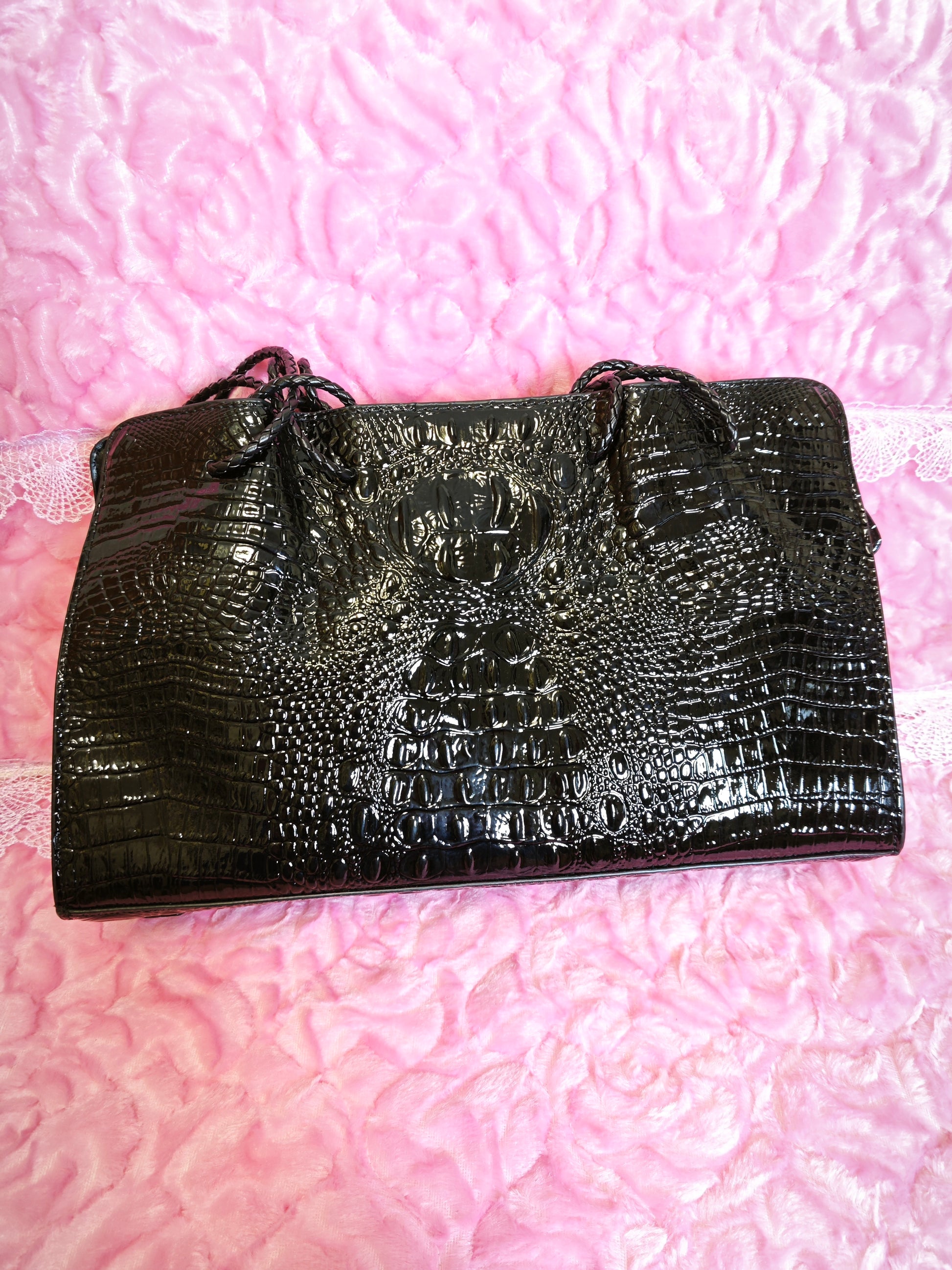 Black Patent 3D Crocodile-Print Handbag with Braided Handles