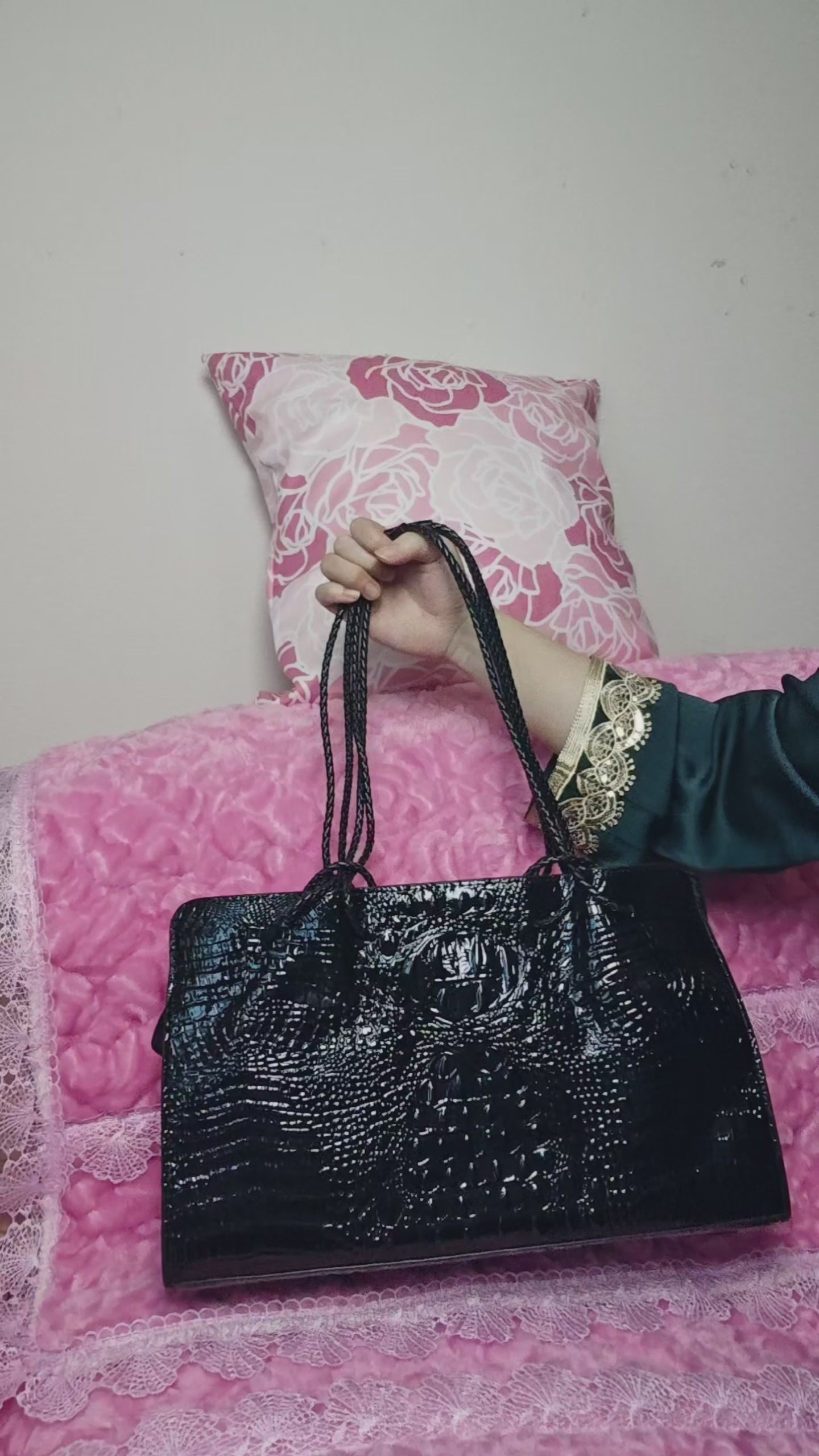 It features a classic handheld tote bag silhouette (straight and bold lines), highlighted by "glossy crocodile pattern + metal hardware + woven handle"—the combination of "pure black base + glossy crocodile pattern + woven handle" creates a "cool and light luxury commuter style" with the calm pure black tone and three-dimensional crocodile pattern details; the pure black bag has a "versatile high-grade filter", and the tote bag shape is suitable for commuting, gatherings, traveling and other style scenarios, making it a "texture and atmosphere highlight" for outfits.