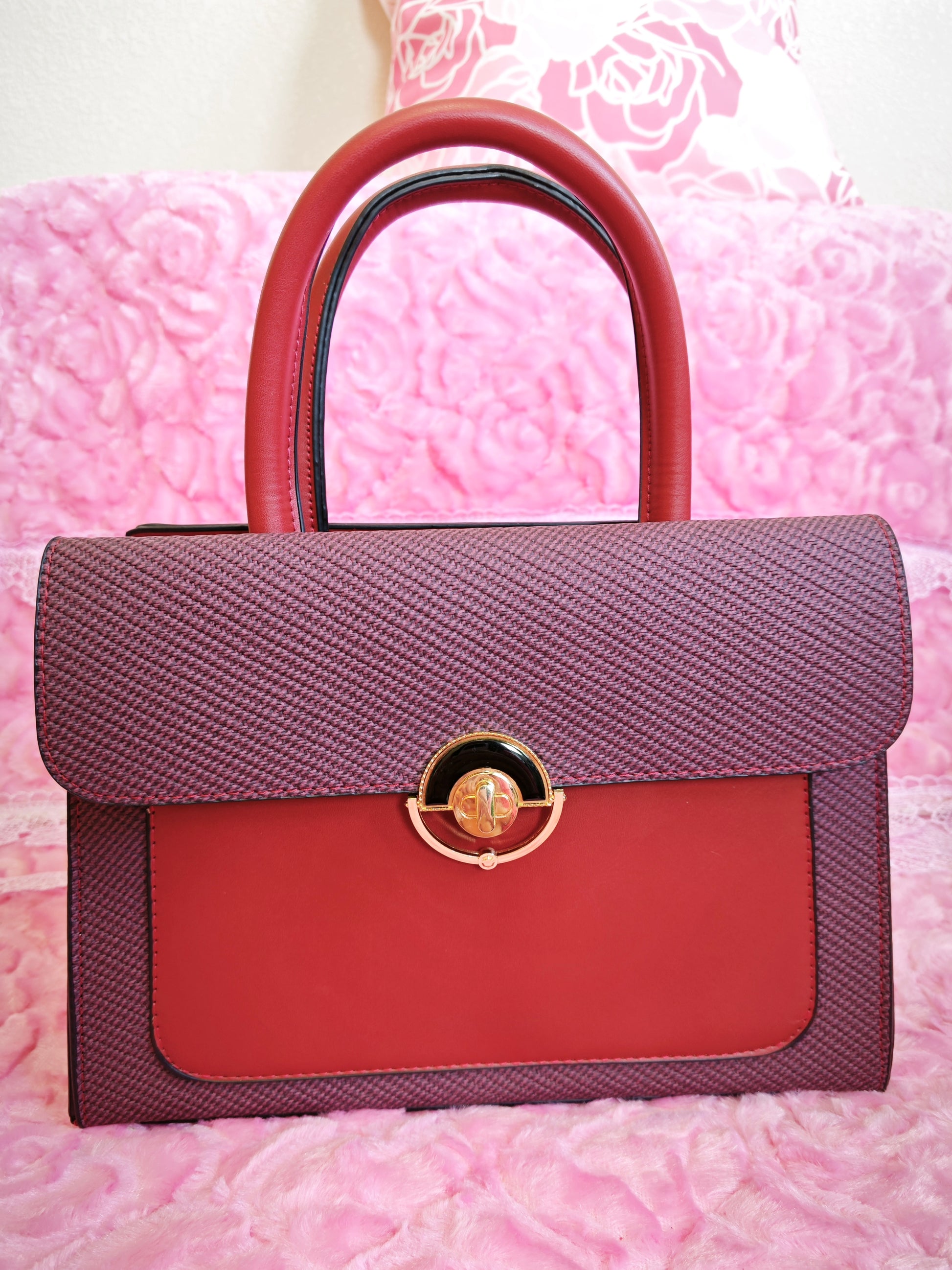Classic mother-child handbag silhouette (smooth and elegant lines), paired with "woven pattern splicing + metal round buckle lock" as accents—it combines "rich wine red base + woven pattern splicing texture + matching leather handle"; the rich texture of wine red collides with the retro details of woven pattern to create a "vintage light luxury lady vibe"; the wine red bag body comes with a "luxury high-end filter," suiting wedding banquets, workplaces, festivals and other style scenarios as a "presence-boosting anchor" for outfits.
