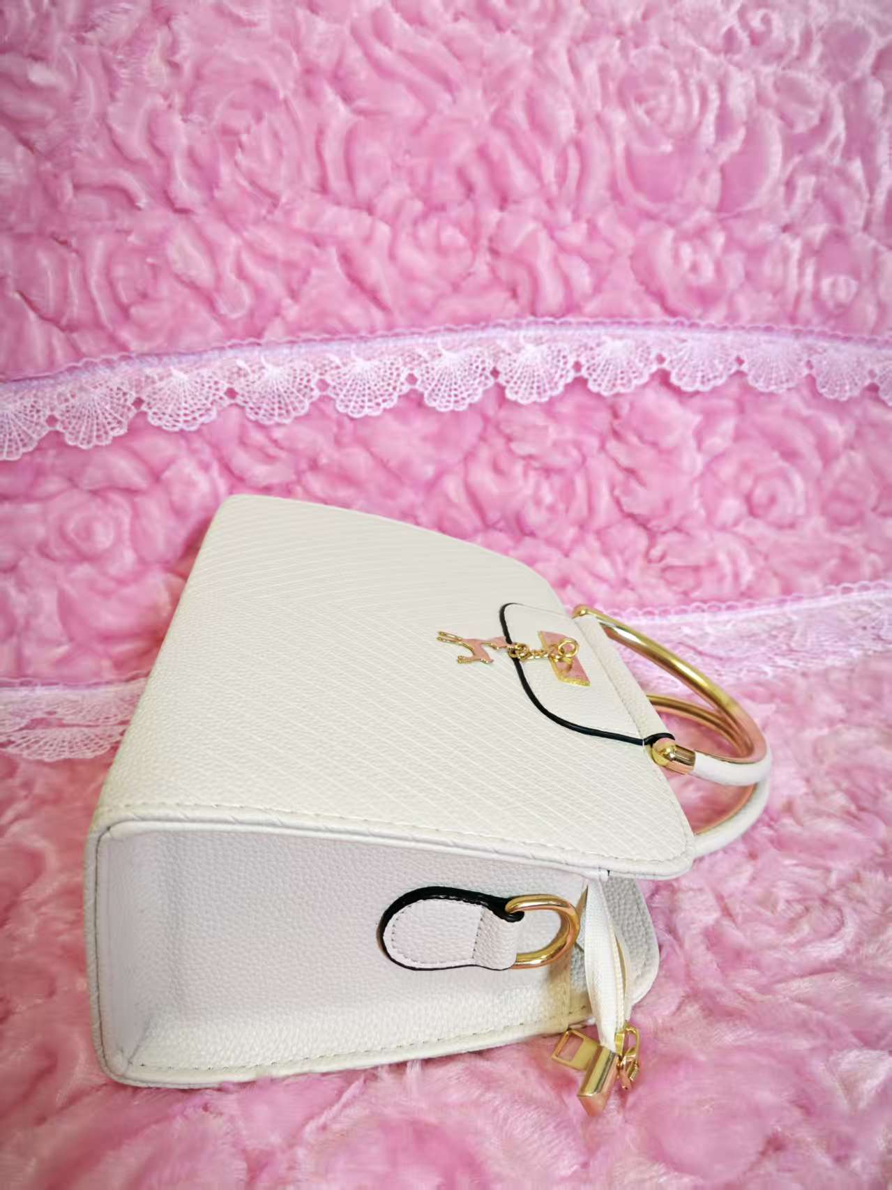 Classic structured bag silhouette (round and elegant lines), paired with "diagonal pattern texture + metal ring handle + deer pendant" as accents—it combines "soft mist off-white base + diagonal pattern texture + gold hardware"; the gentle purity of off-white collides with the vivid details of the pendant to create a "sweet light luxury style"; the off-white bag body comes with a "versatile high-end filter", suiting dating parties, workplace commuting, daily outings and other style scenarios as a "sweet texture anchor" for outfits.