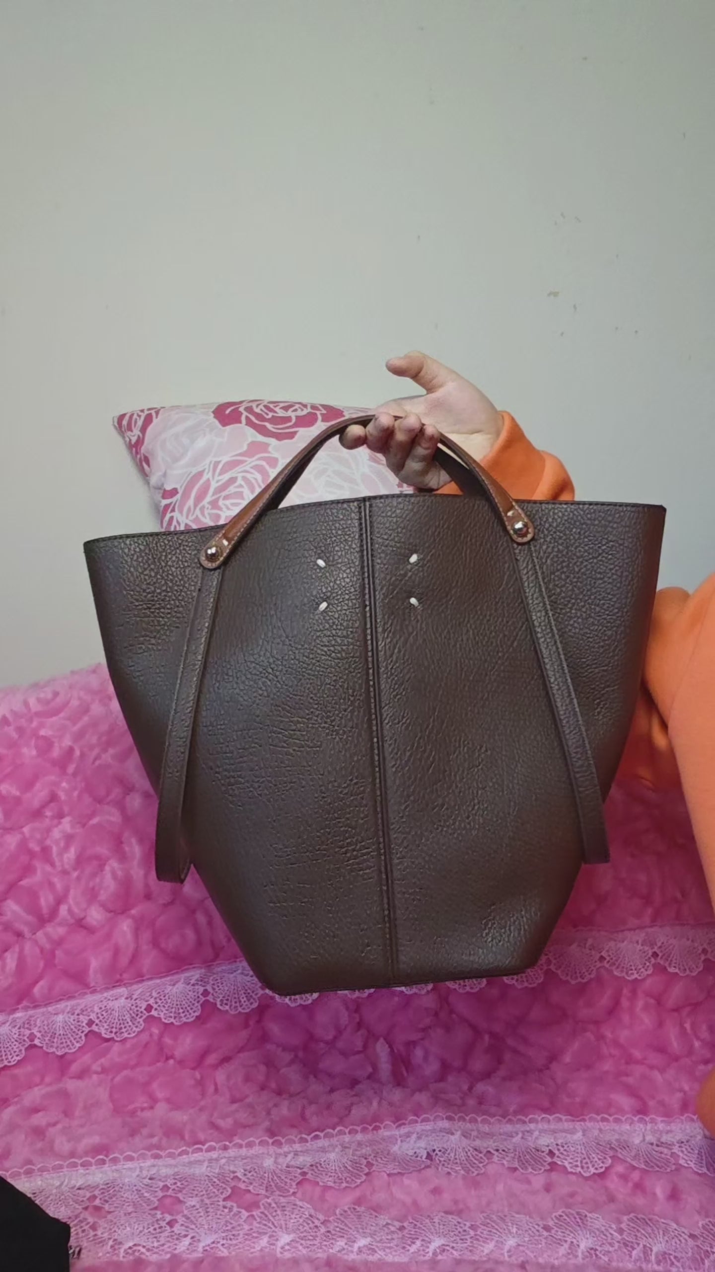 Sleek bucket tote silhouette (soft and smooth lines), paired with "lychee pattern texture + contrast handle" as accents—it combines "retro caramel brown base + lychee pattern texture + contrast handle"; the calm texture of dark brown collides with the retro details of the pattern to create a "lazy light luxury commuter vibe"; the dark brown bag body comes with a "high-quality texture filter," suiting casual/intellectual style scenarios as a "retro texture anchor" for outfits.
