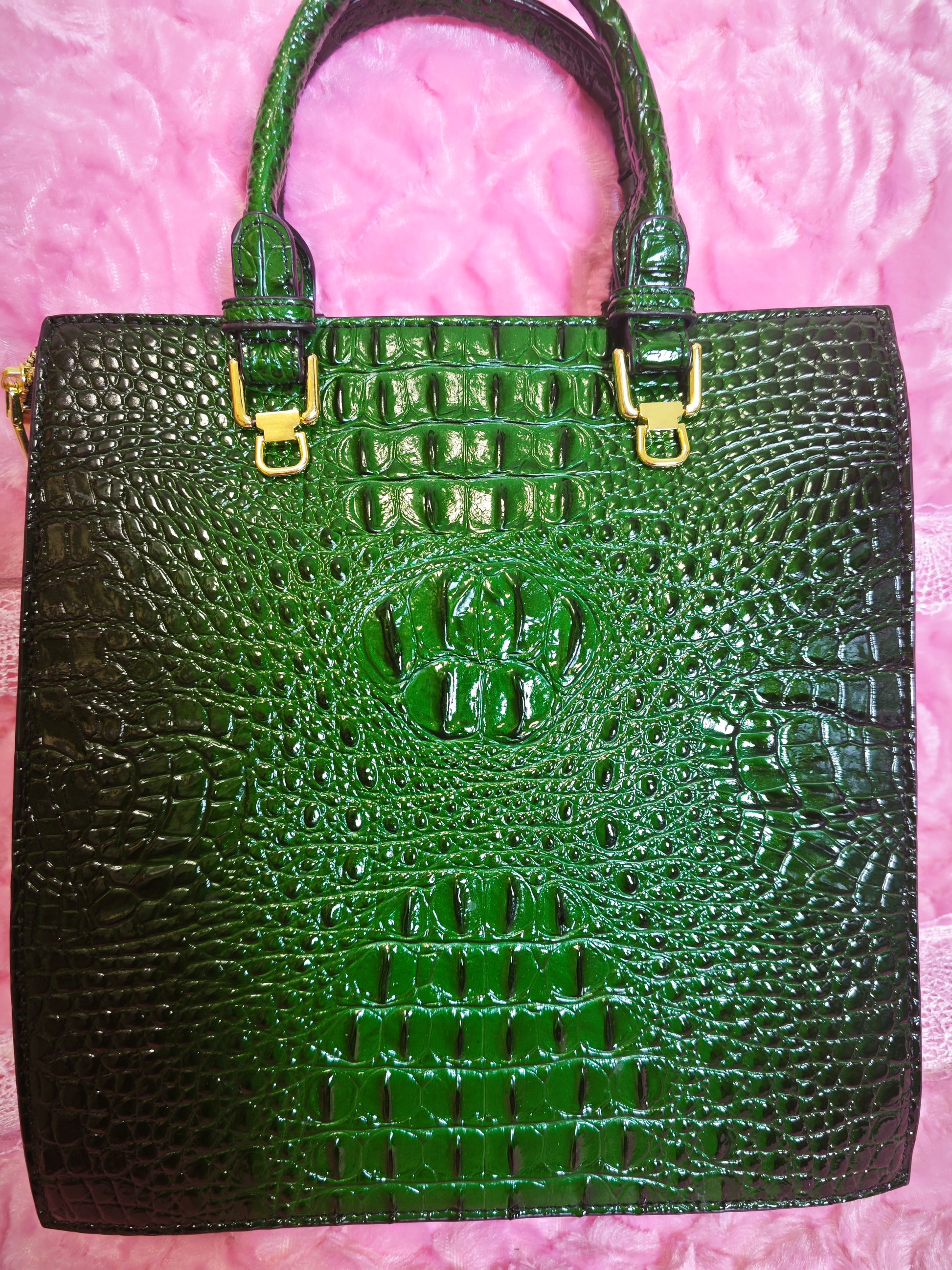 It features a classic square tote bag silhouette (neat and straight lines), highlighted by "glossy crocodile pattern + gold hardware + metal chain"—the combination of "gradient dark green base + glossy crocodile pattern + metal chain" creates a "retro socialite light luxury style" with the rich dark green tone and three-dimensional crocodile pattern details; the dark green bag has a "high-grade eye-catching filter", and the square tote bag shape is suitable for banquets, commuting, dates and other style scenarios, making it a "luxury texture highlight" for outfits.