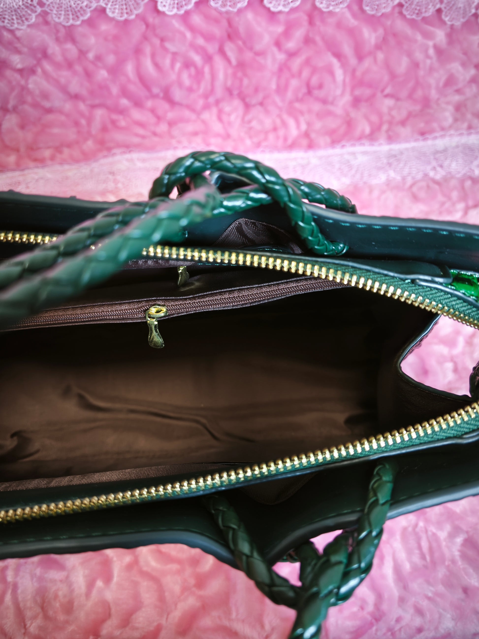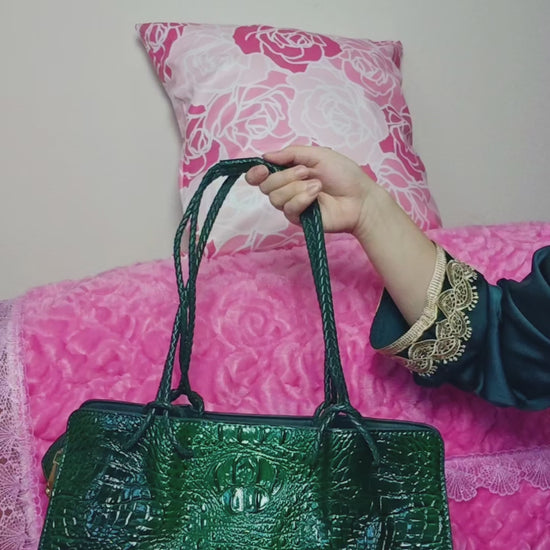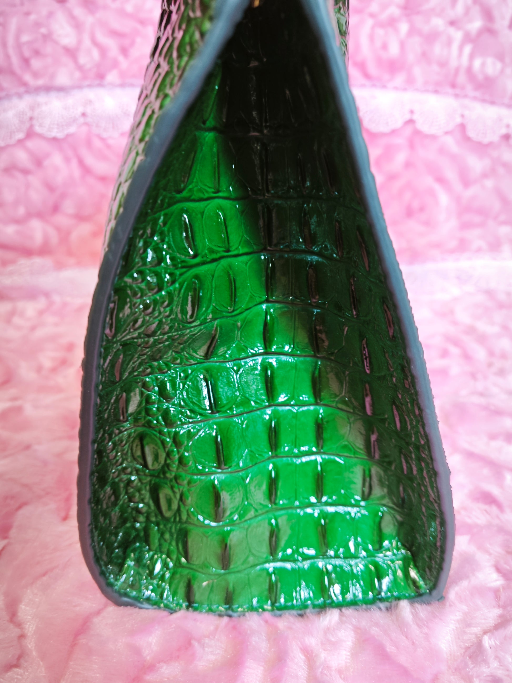 Dark Green Patent 3D Crocodile-Print Handbag with Braided Handles
