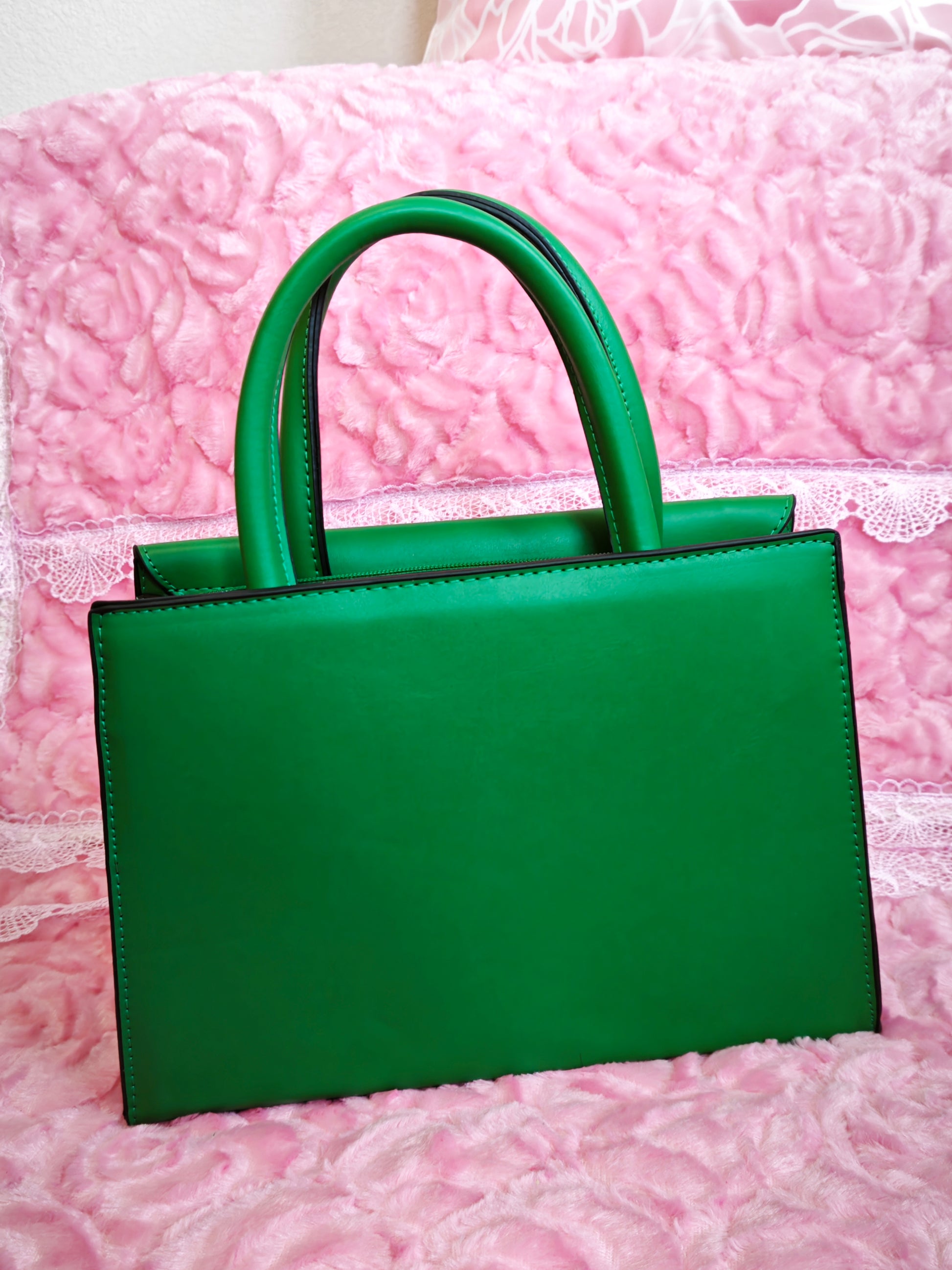 Classic mother-child handbag silhouette (neat and simple lines), paired with "color-block diagonal stripes + metal lock" as accents—it combines "emerald base + dark green diagonal stripes + gold hardware"; the vibrant texture of bright green and the exquisite details of the patchwork create a "retro elegant commuter vibe"; the emerald bag body comes with an "eye-catching high-end filter," suiting workplace, dating, parties and other style scenarios as an "eye-catching texture focus" for outfits.