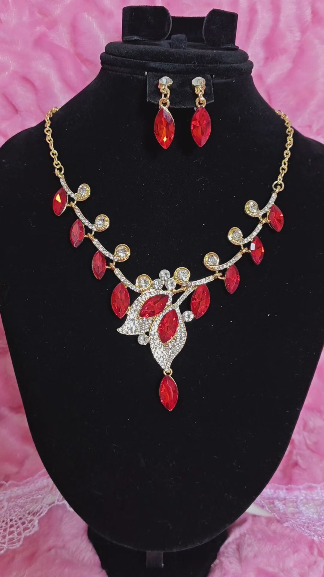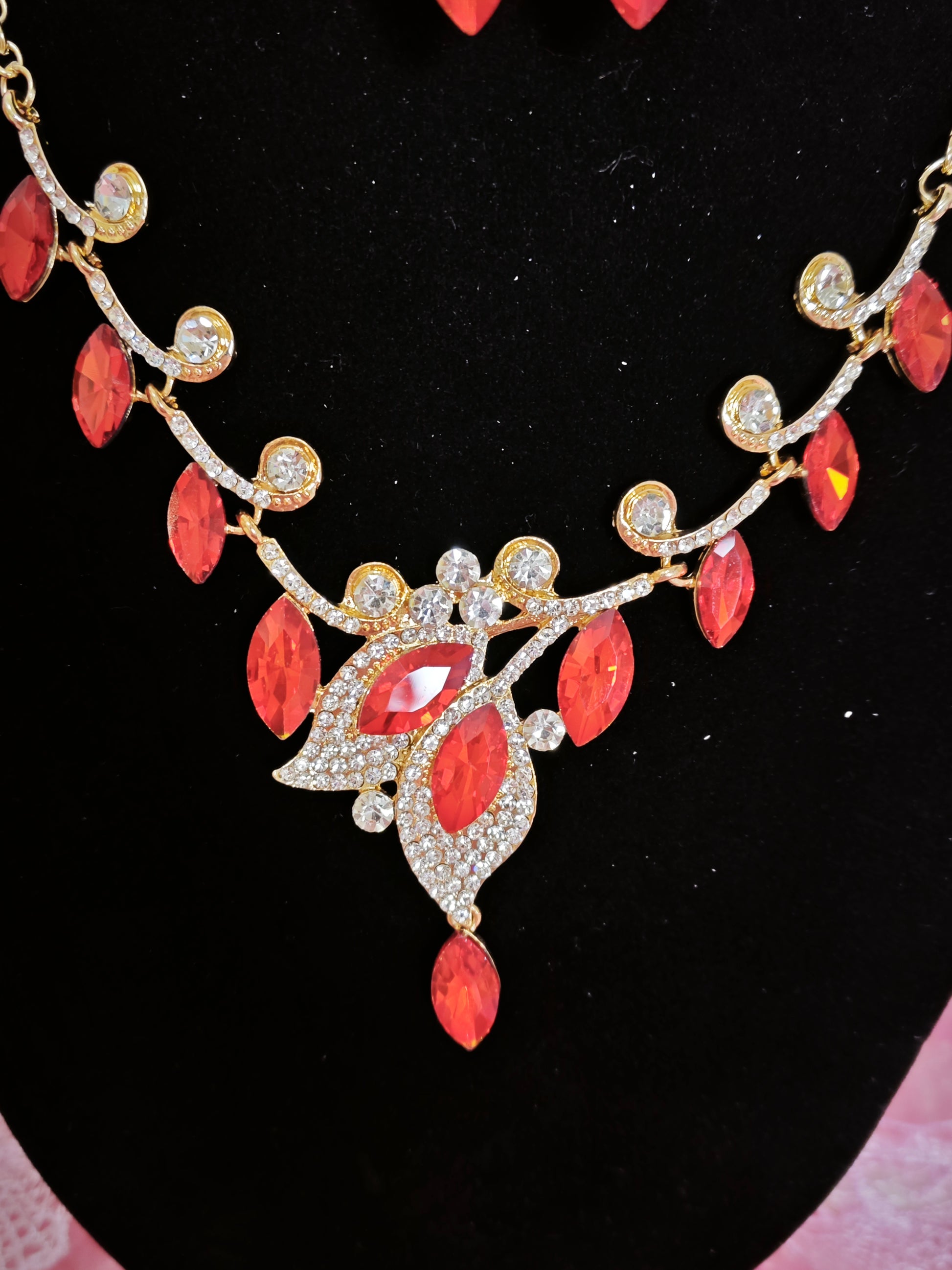 Gilded Red Gem Leaf & Teardrop Necklace & Earring Set