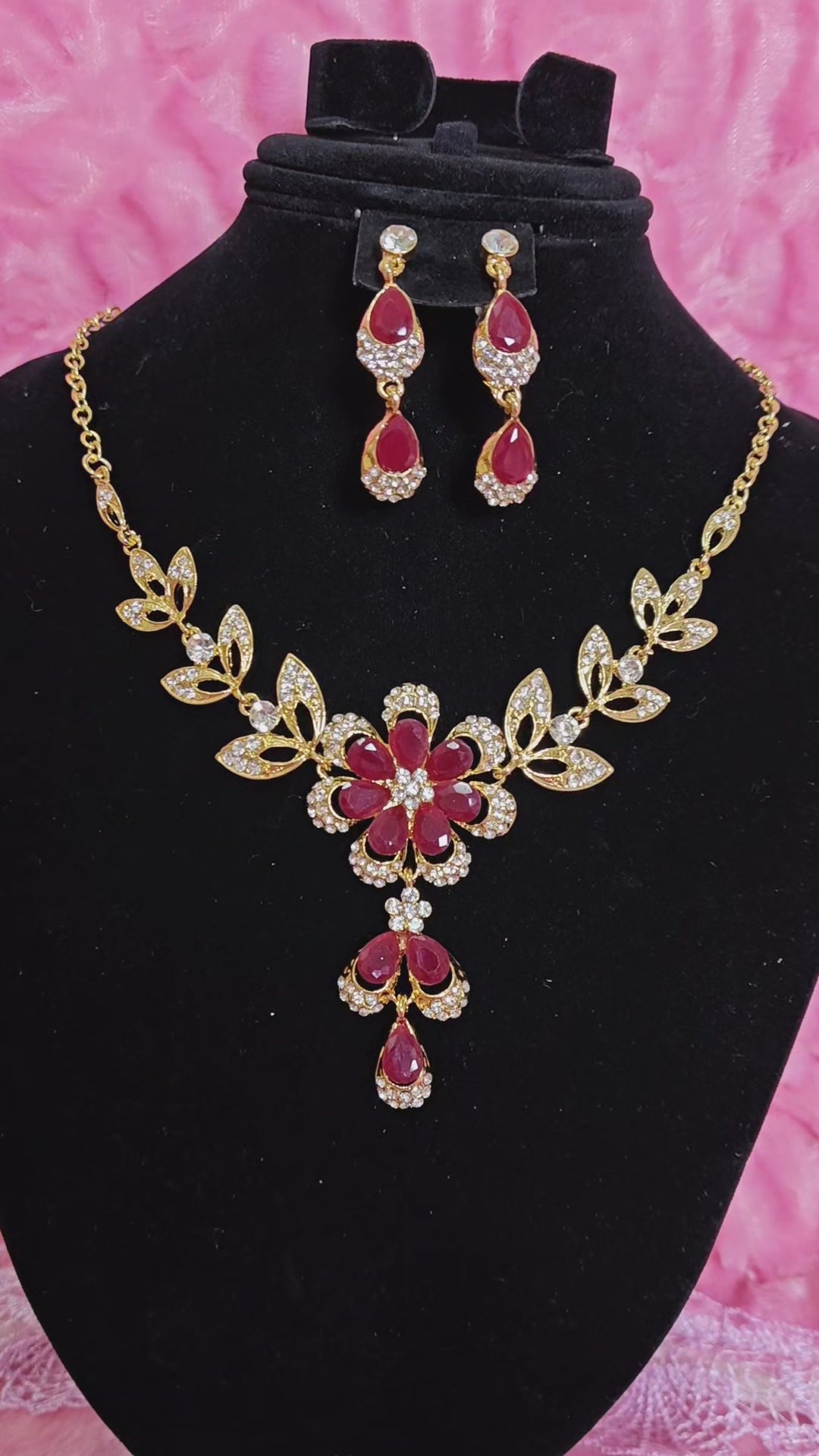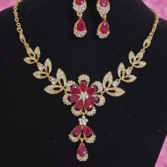 Gilded Ruby & Crystal Floral Necklace & Earring Set