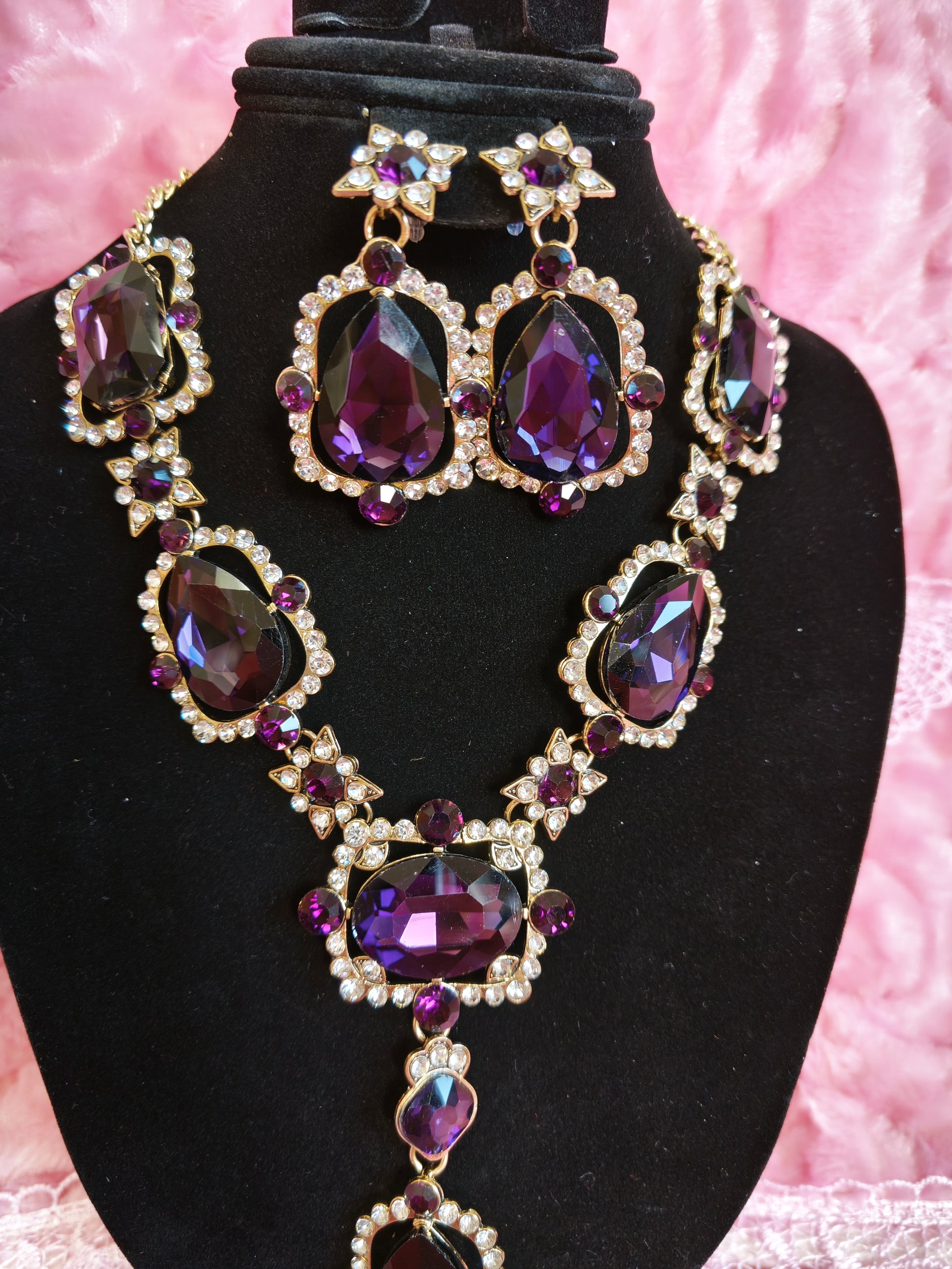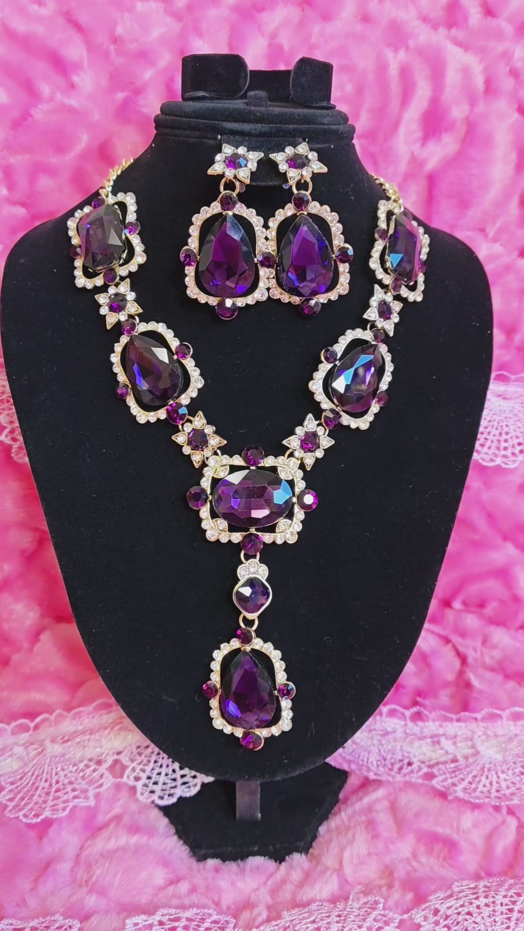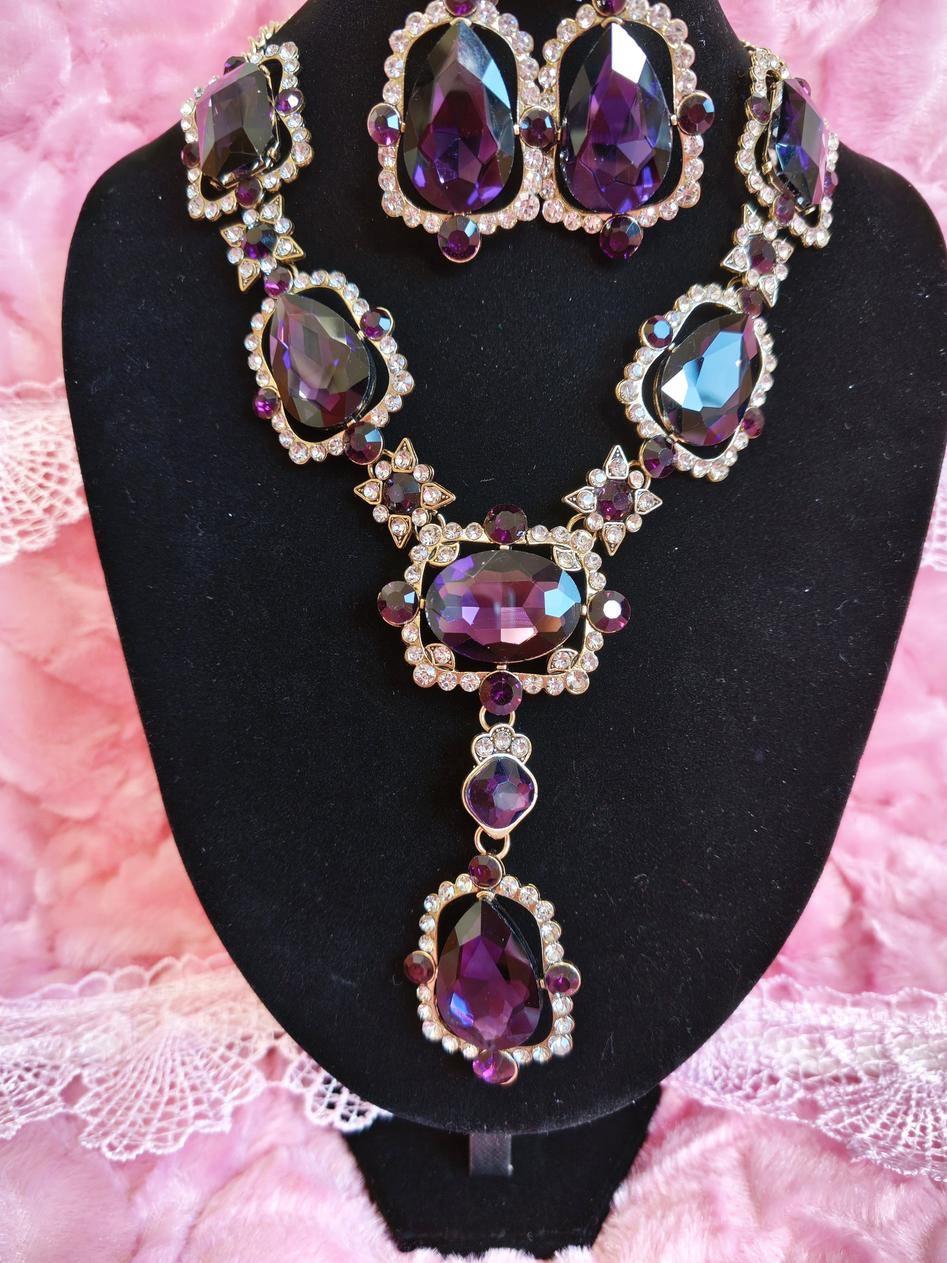 It features a classic exaggerated dinner jewelry set silhouette (full and bold lines), highlighted by "large violet rhinestone main stones + pavé small rhinestones + pendant necklace design". The combination of "rich violet rhinestone base + shiny small rhinestone border color contrast" creates a "retro luxury dinner style" with full rhinestone texture and bright gold metal luster. The combination of pendant necklace + stud earrings has an "eye-catching atmosphere filter", and the shape is suitable for banquets, parties, annual meetings, stage performances and other formal style scenarios, making it a "luxurious highlight" for outfits.