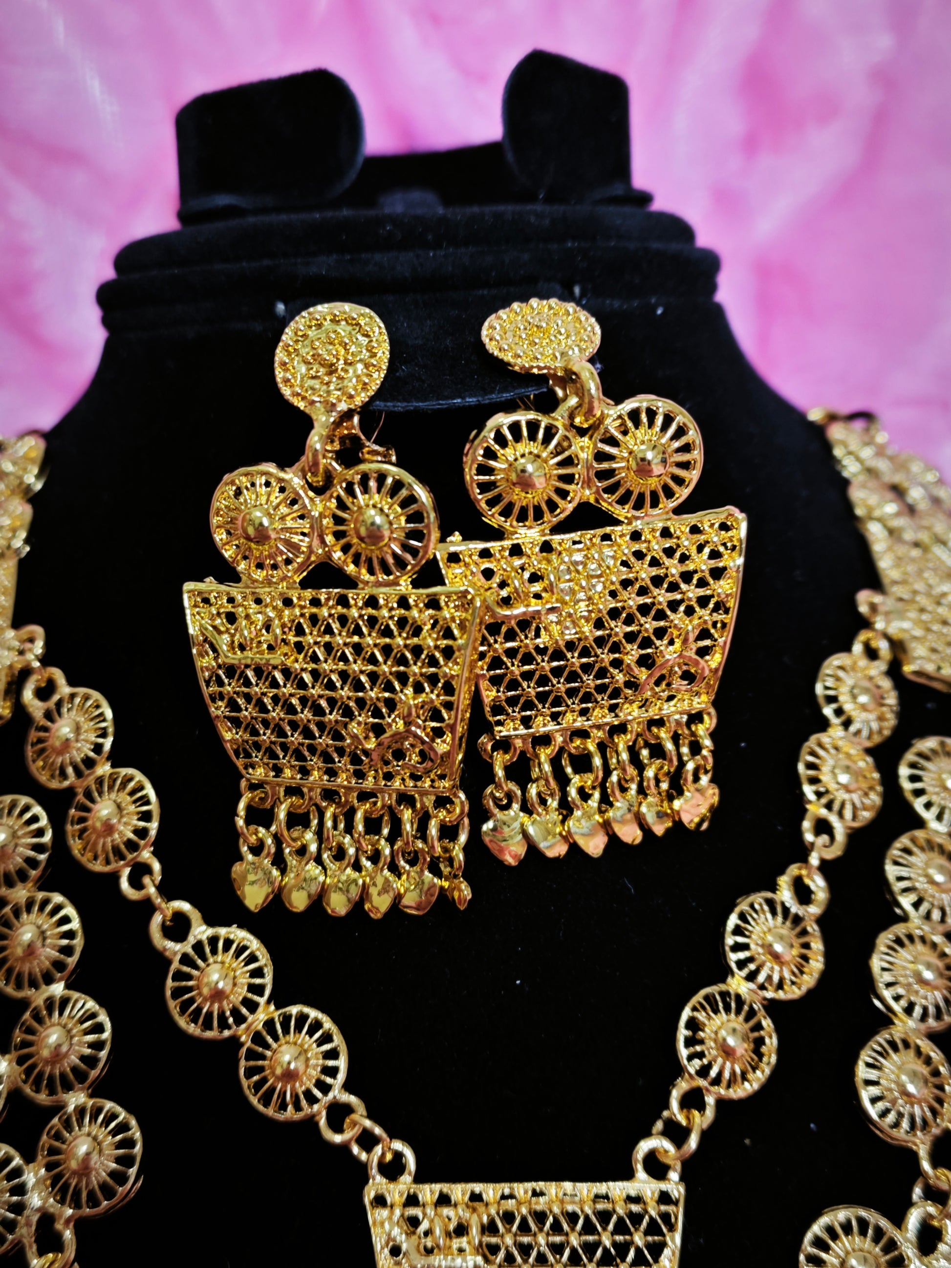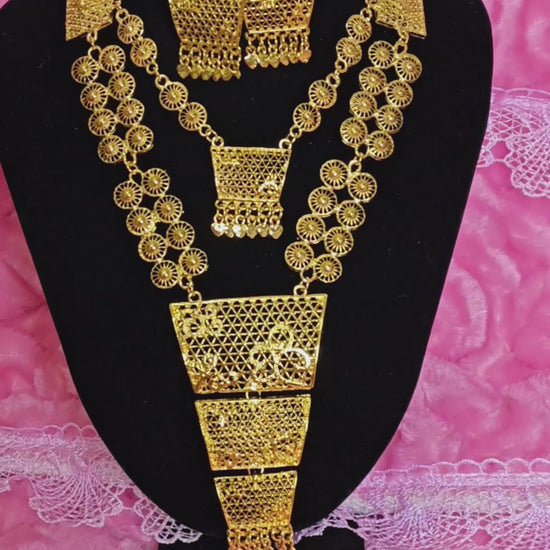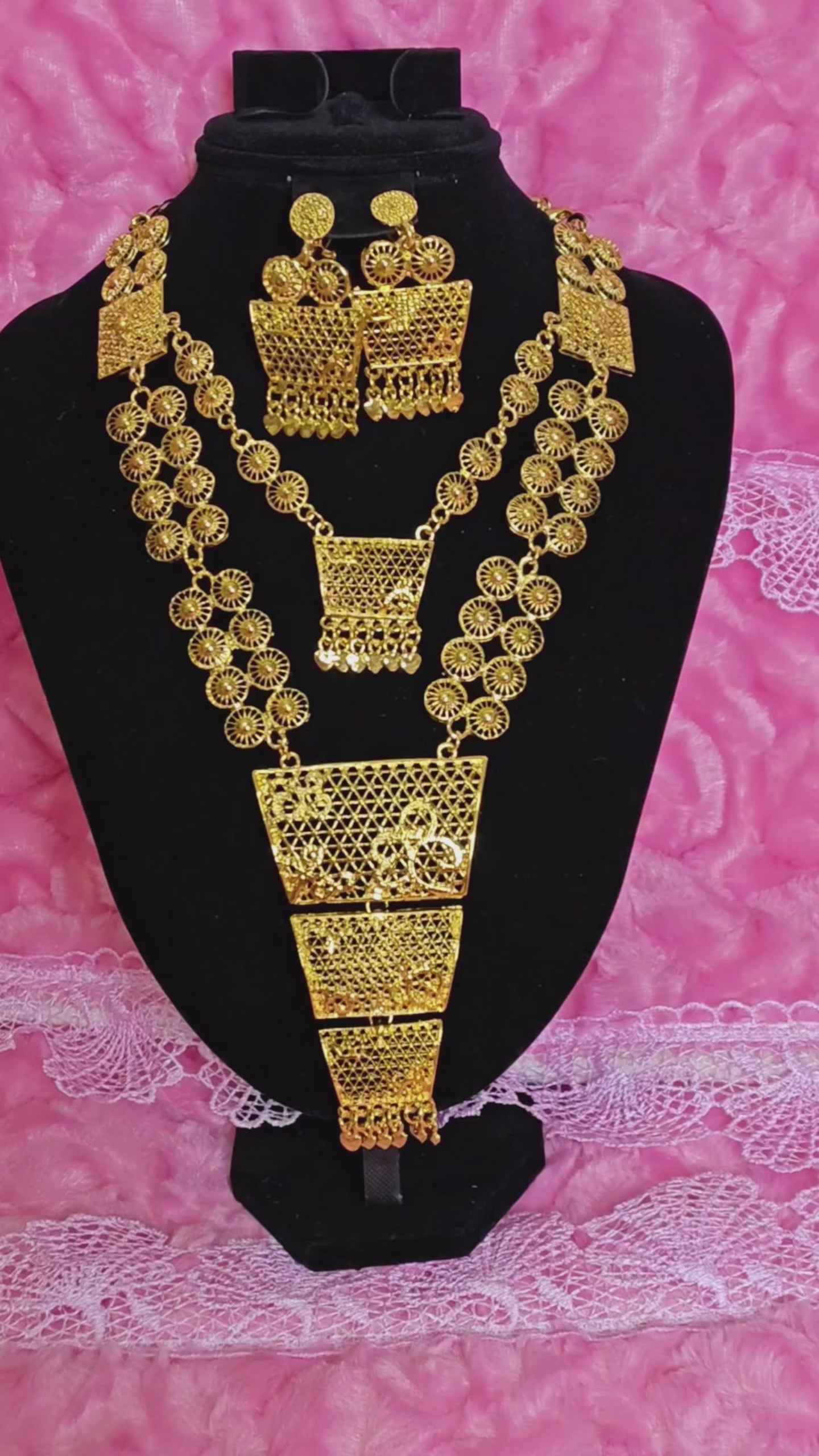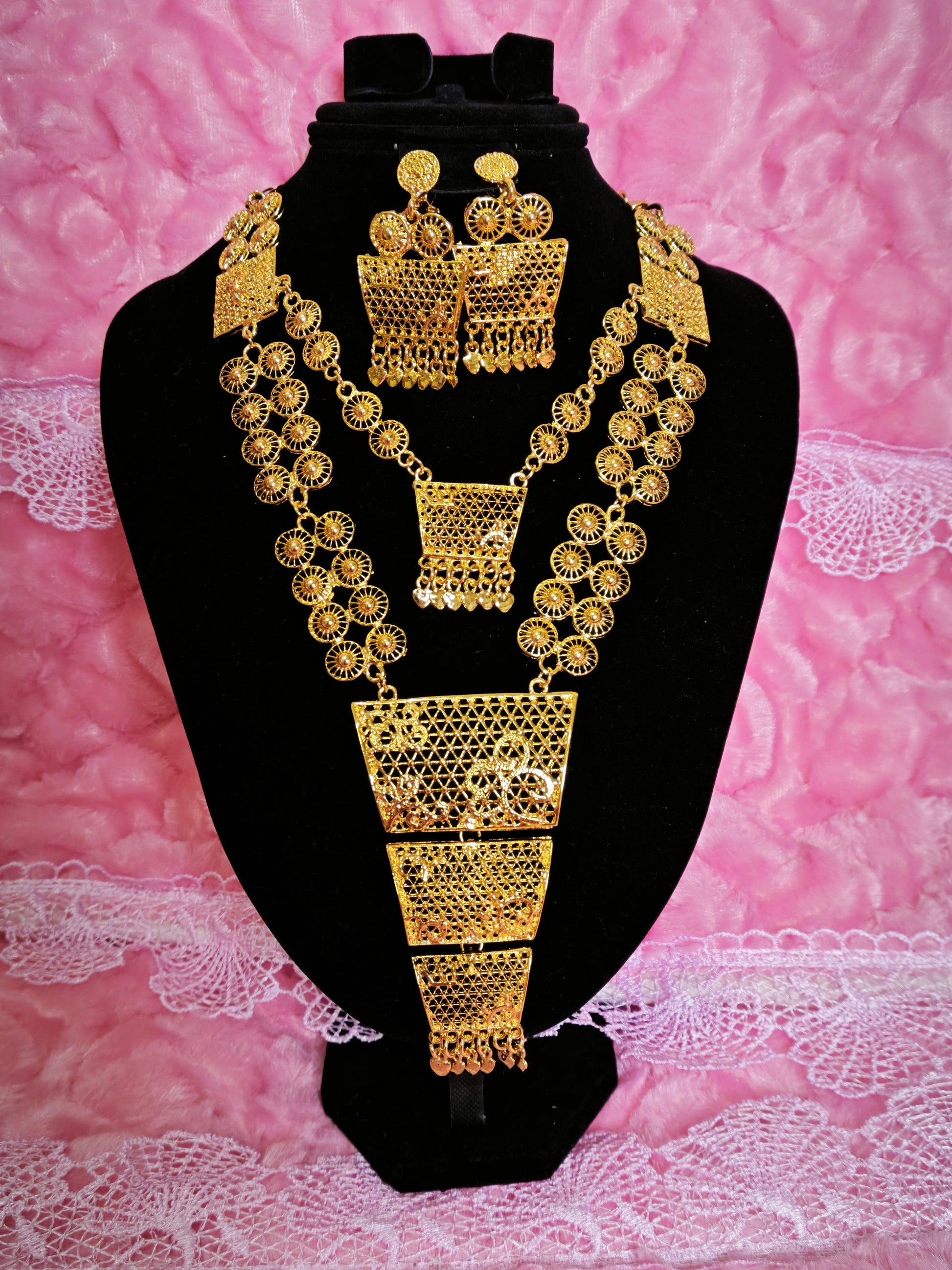 It adopts the Middle Eastern geometric hollow heavy industry gilded jewelry set design (three-dimensional and thick shape with a Middle Eastern artistic sense), highlighted by "geometric grid hollow + multi-layer chain layering". The combination of "bright gilded yellow metal luster + layered texture of geometric hollow" creates a "Middle Eastern heavy industry + exotic luxury style" with regular grid weaving texture and full gilded color. The two-piece set of necklace + earrings has a "luxury ritual sense filter", and the shape is suitable for various high-spec scenarios such as Middle Eastern folk celebrations, exotic theme weddings, and luxury cultural dinners, making it the "luxury core" of the outfit.