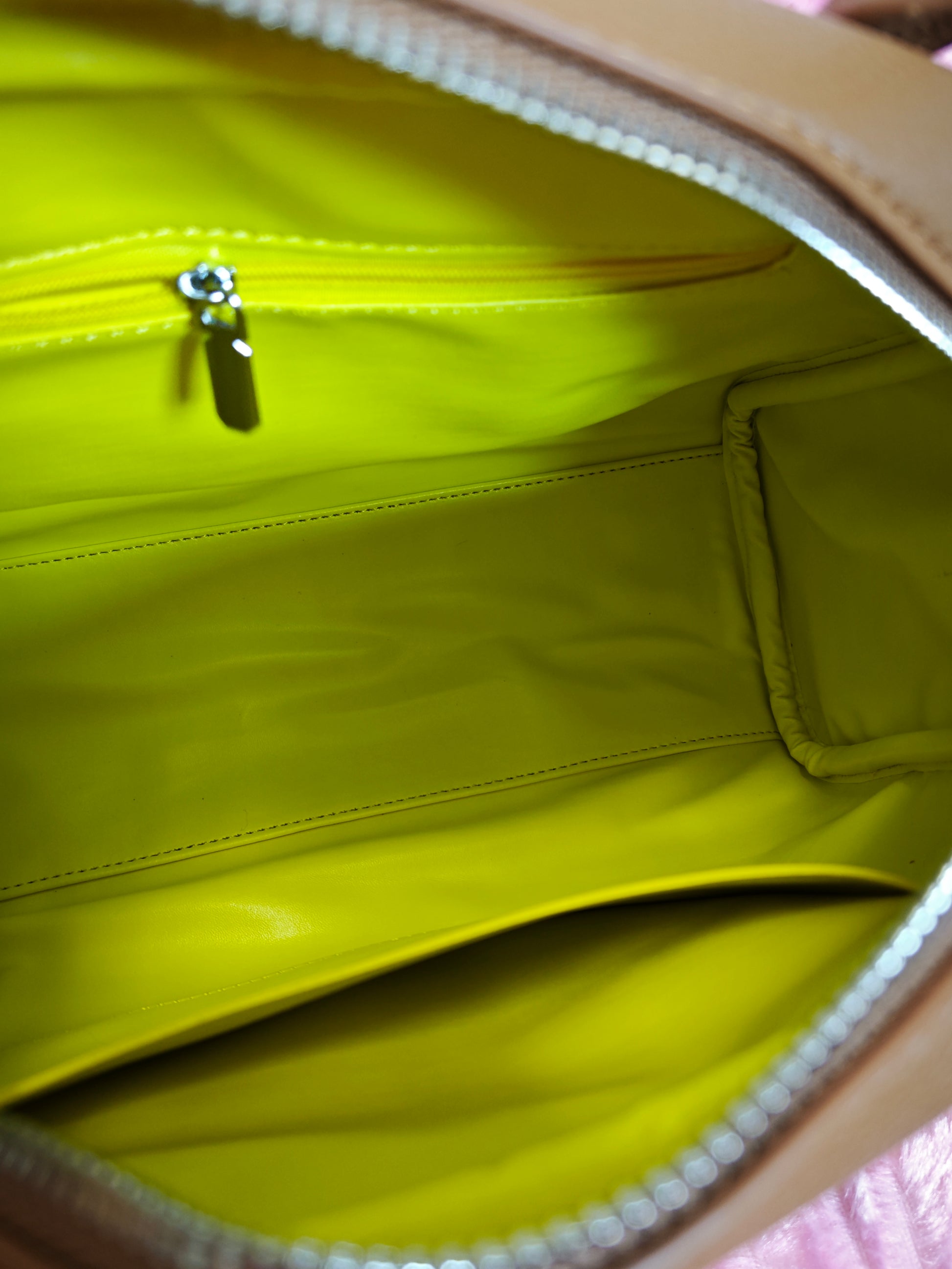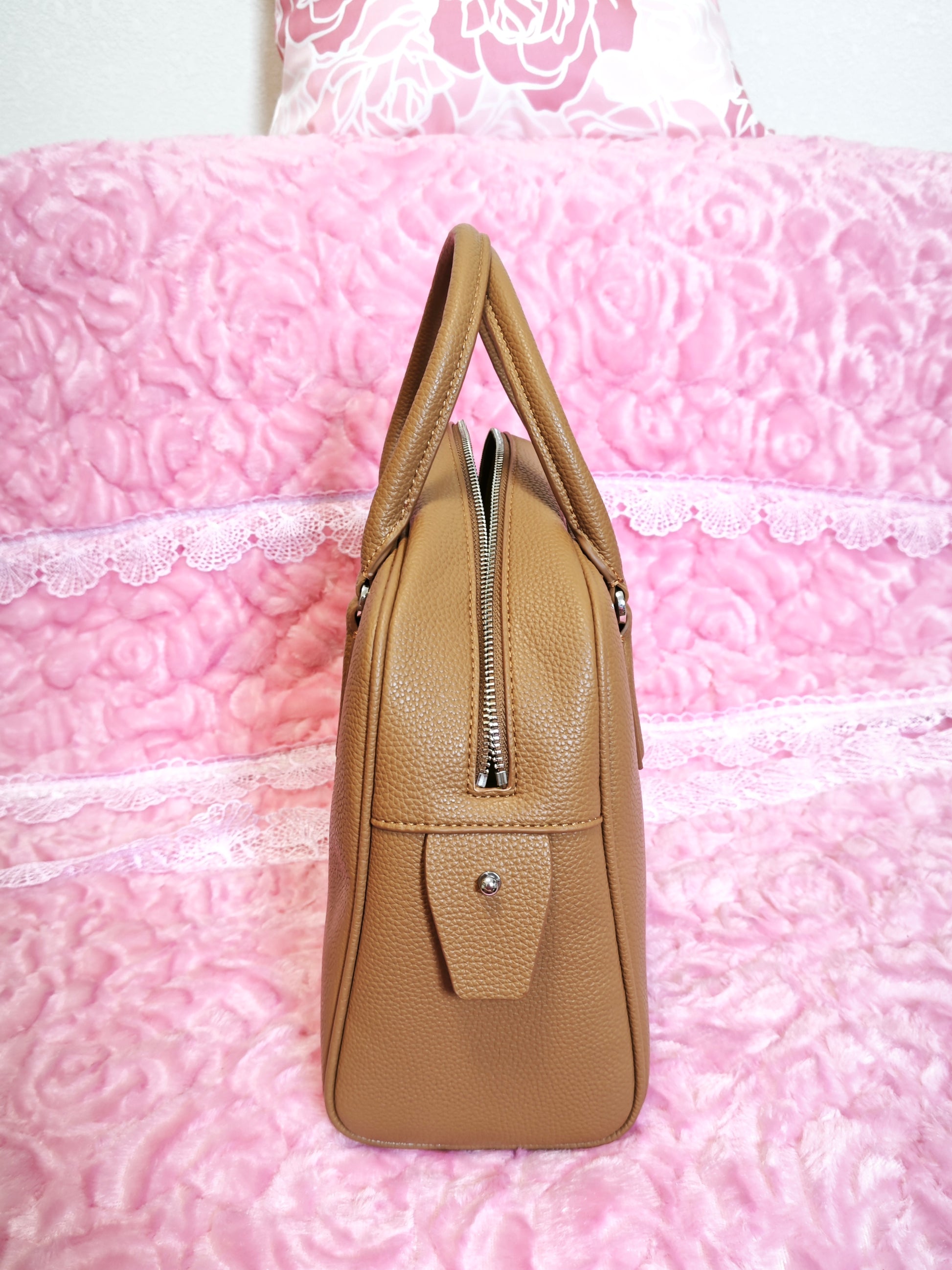 Light Brown Lychee-Patterned Handbag with Contrast Zipper