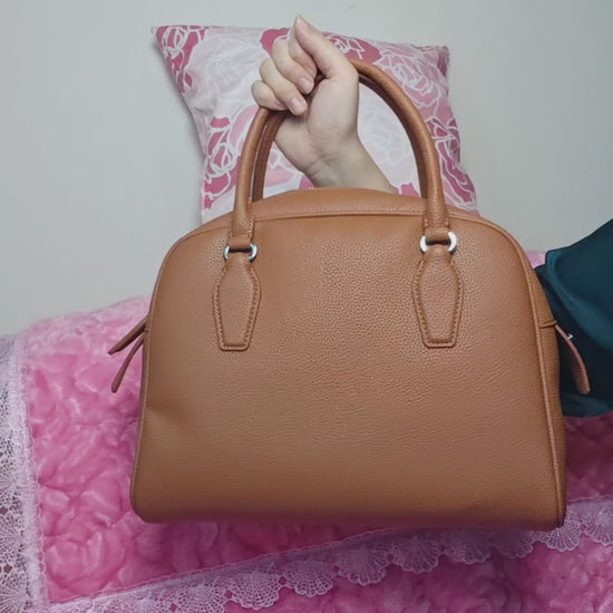 It features a classic large bowling semi-circular bag silhouette (smooth and round lines, the semi-circular arc of the bag body is more design-oriented), highlighted by "lychee pattern texture + metal hardware + simple handle". The combination of "caramel base + lychee pattern texture + matching handle" creates a "gentle light luxury commuter style" with the warm caramel tone and delicate lychee pattern details. The caramel bag has a "warm versatile filter", and the large bowling semi-circular bag shape is suitable for commuting, gatherings, traveling and other style scenarios, making it a "gentle elegant highlight" for outfits.
