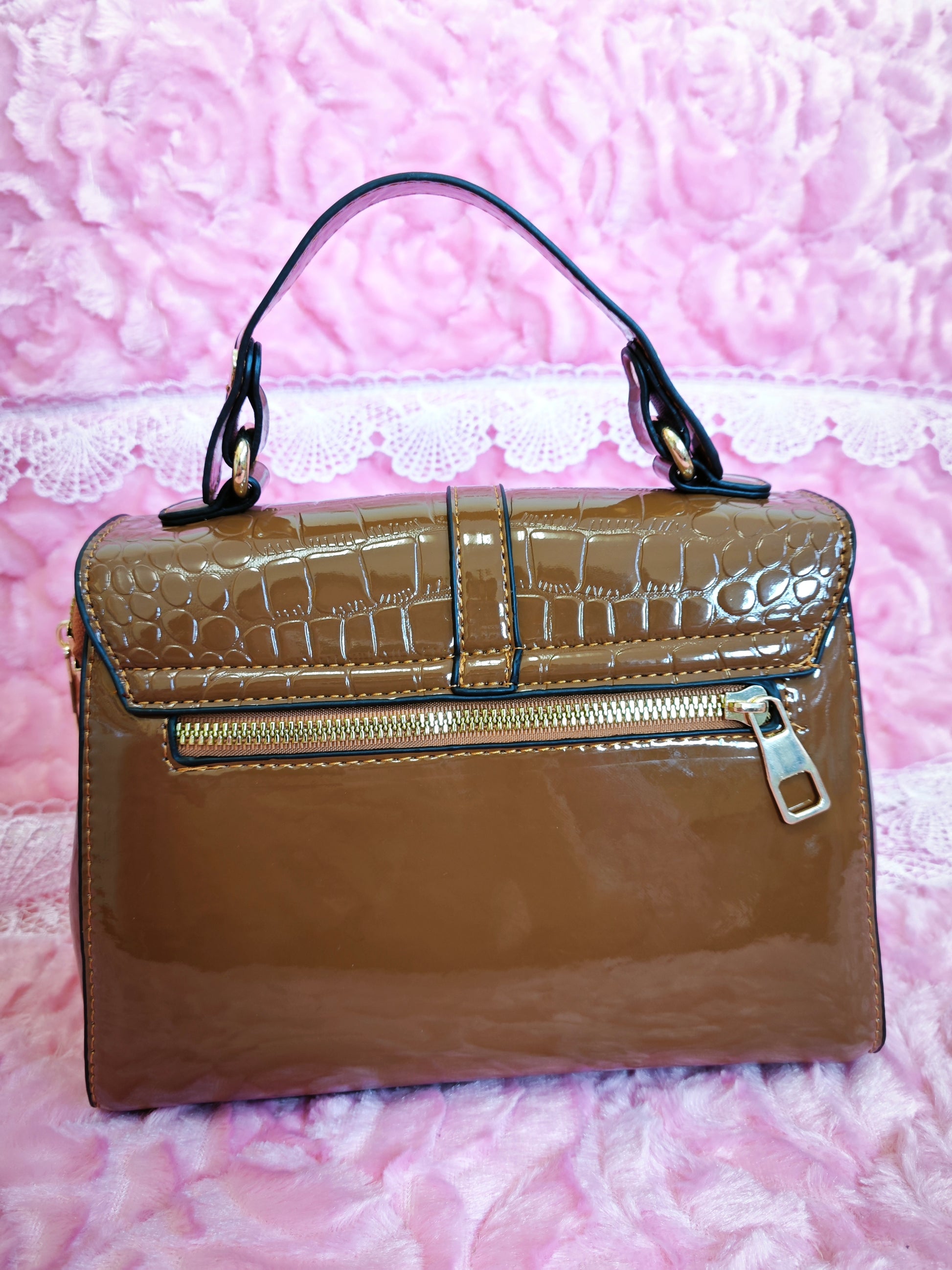 Light Brown Patent Crocodile-Print Handbag with Metal Lock