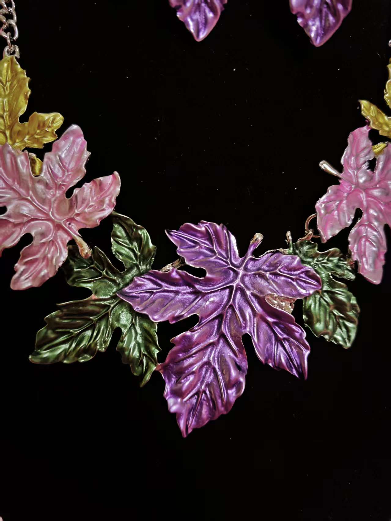 It features a classic exaggerated dinner jewelry set silhouette (full and bold lines), highlighted by the core design of "maple leaf embossed shape + color contrast of purple, pink, gold and green enamel". The three-dimensional structure of stacked leaves makes the overall shape full of layering. The combination of pendant necklace + stud earrings has an "eye-catching atmosphere filter", and the shape is suitable for banquets, parties, annual meetings, stage performances and other formal style scenarios, making it a "luxurious highlight" for outfits.