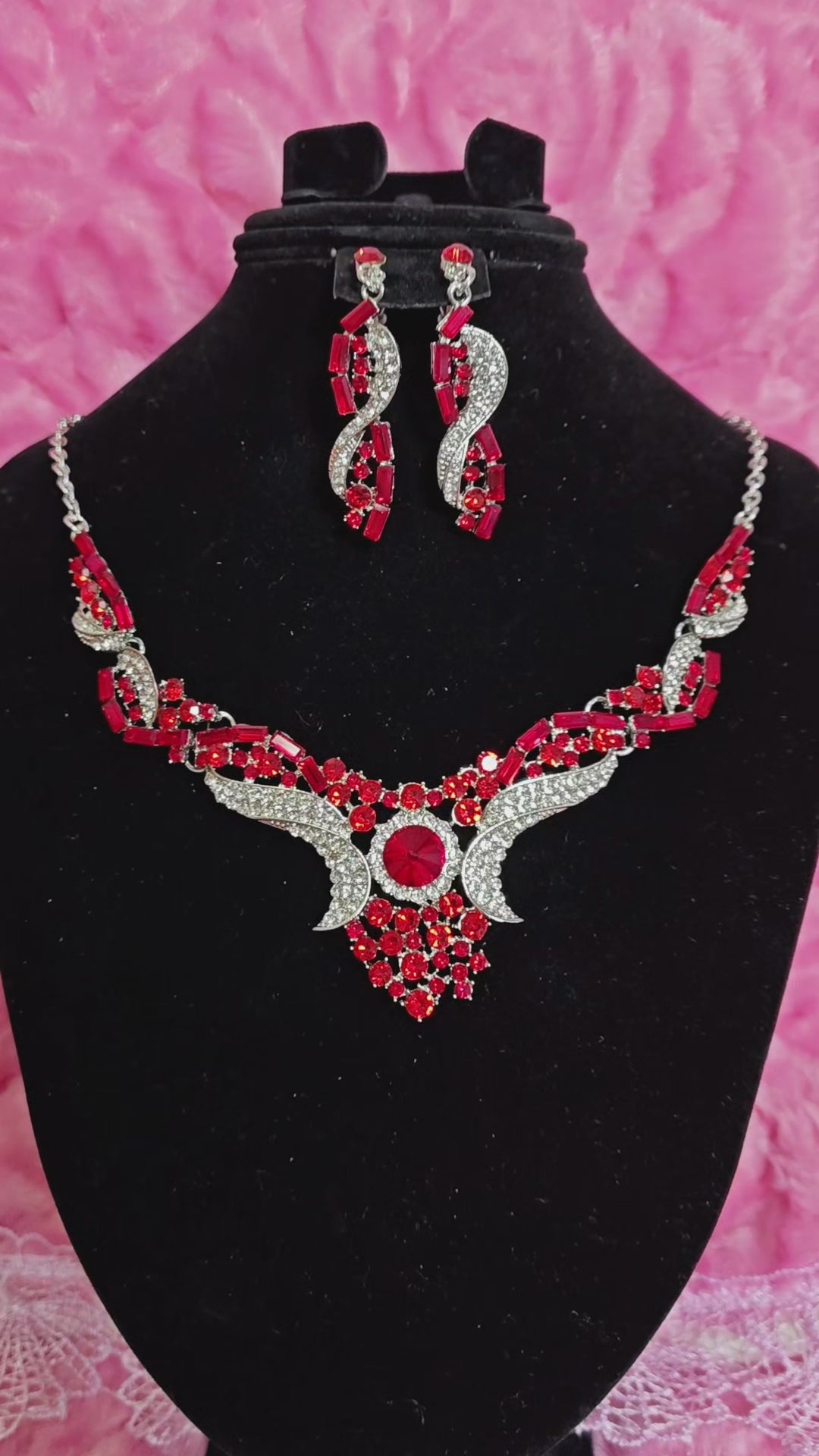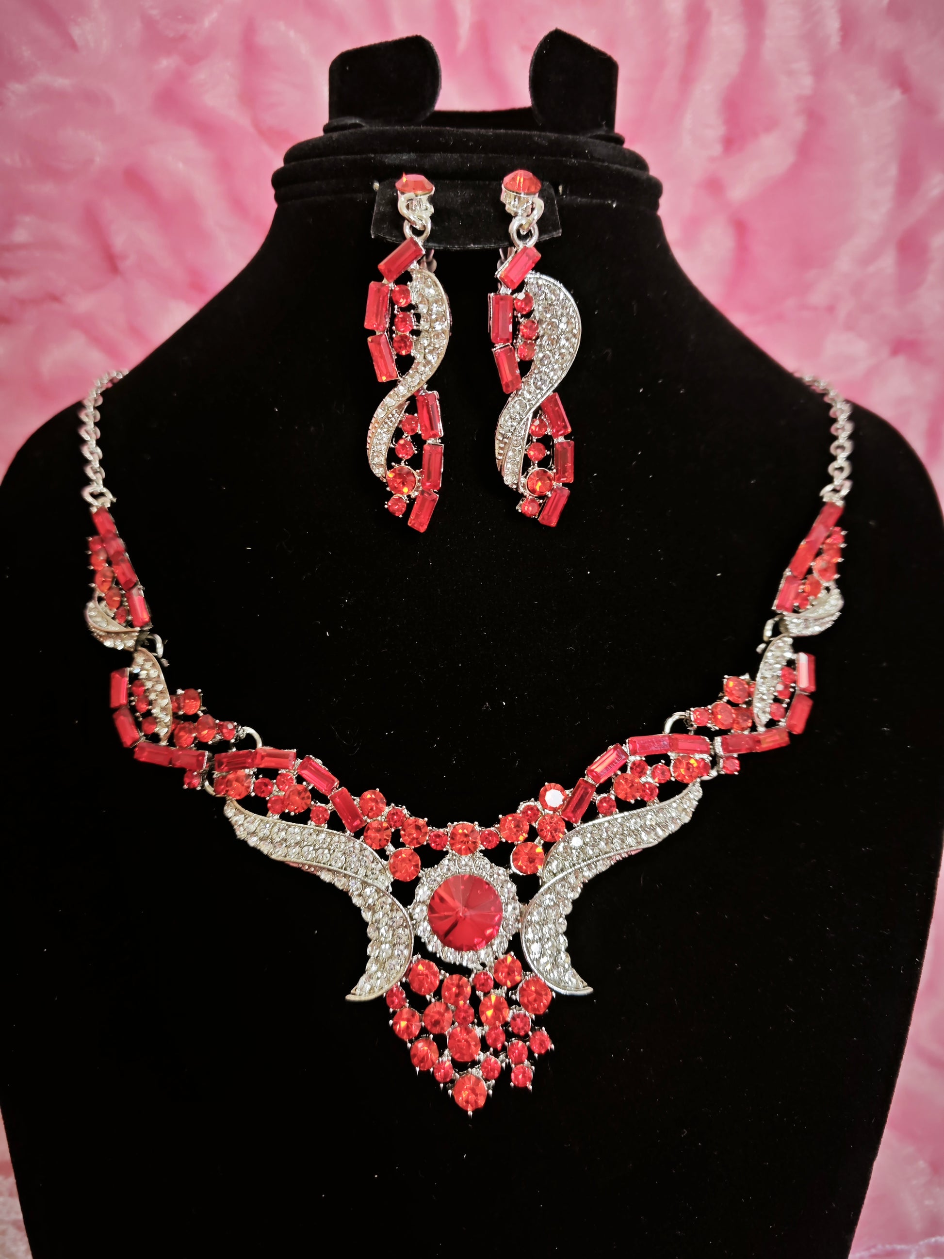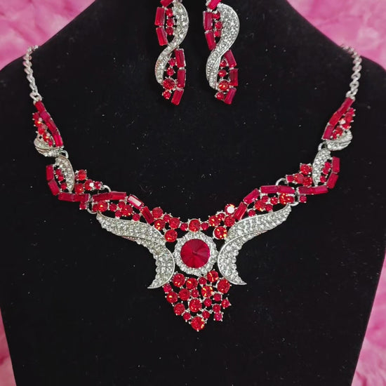 Red Crystal & Diamond Wing Necklace & Earring Set