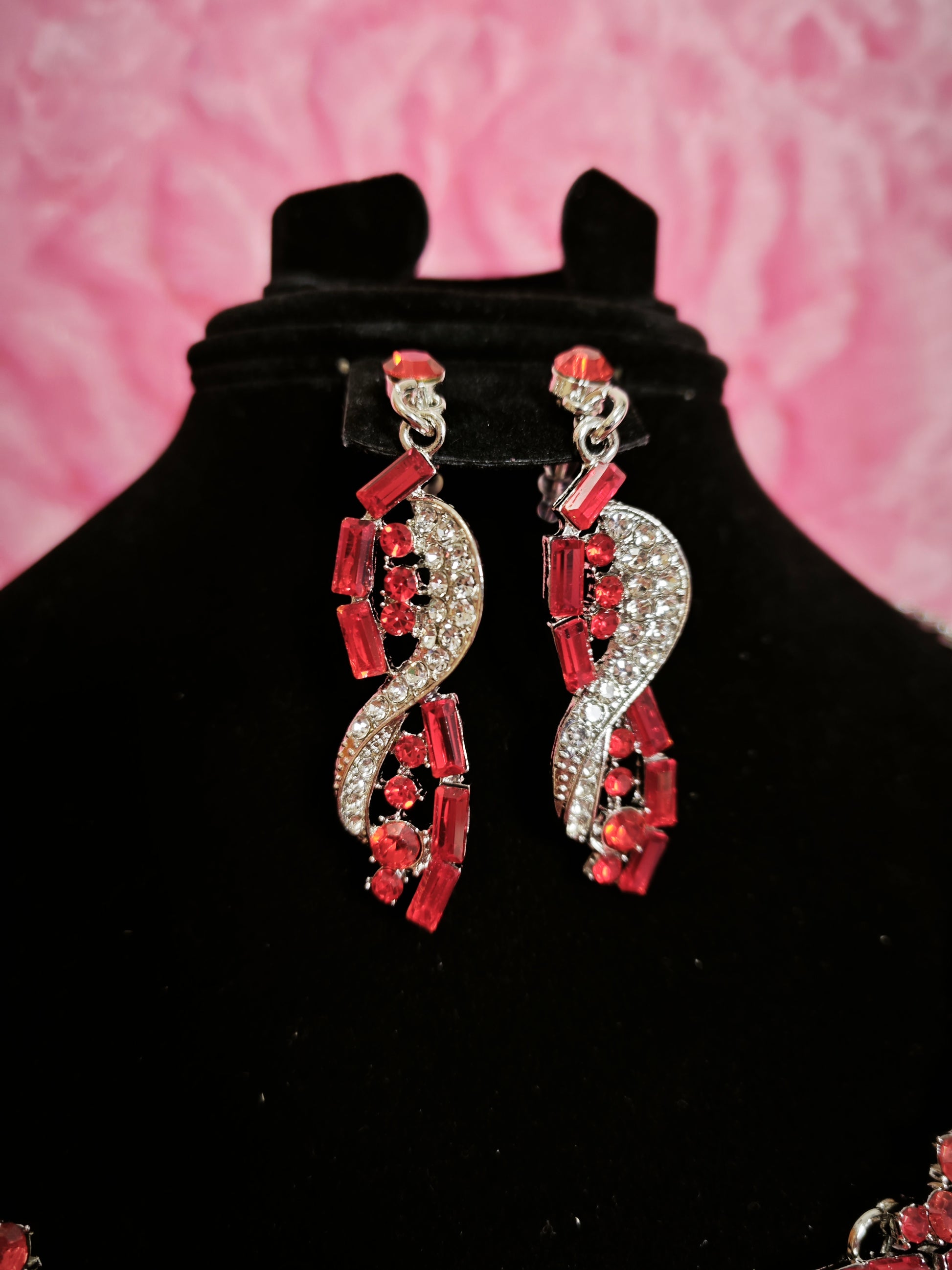 Crafted with high-quality zinc alloy and rhinestone pave setting technology, the front presents a bright and luxurious visual effect with true red rhinestones, streamlined silver-white metal frames and pavé white small rhinestone setting technology. The metal base is made of zinc alloy (hard texture and moderate quality), and the rhinestone inlay adopts firm hand claw setting technology, which is not easy to fall off. The zinc alloy is finely polished and buffed, with both wear-resistant and scratch-resistant properties. The true red rhinestones are selected with high-transparency rhombus cut styles, with full refractive luster. It not only retains the gorgeous and shiny texture of dinner jewelry, but also can maintain a delicate shape for a long time during wearing.