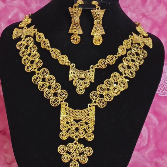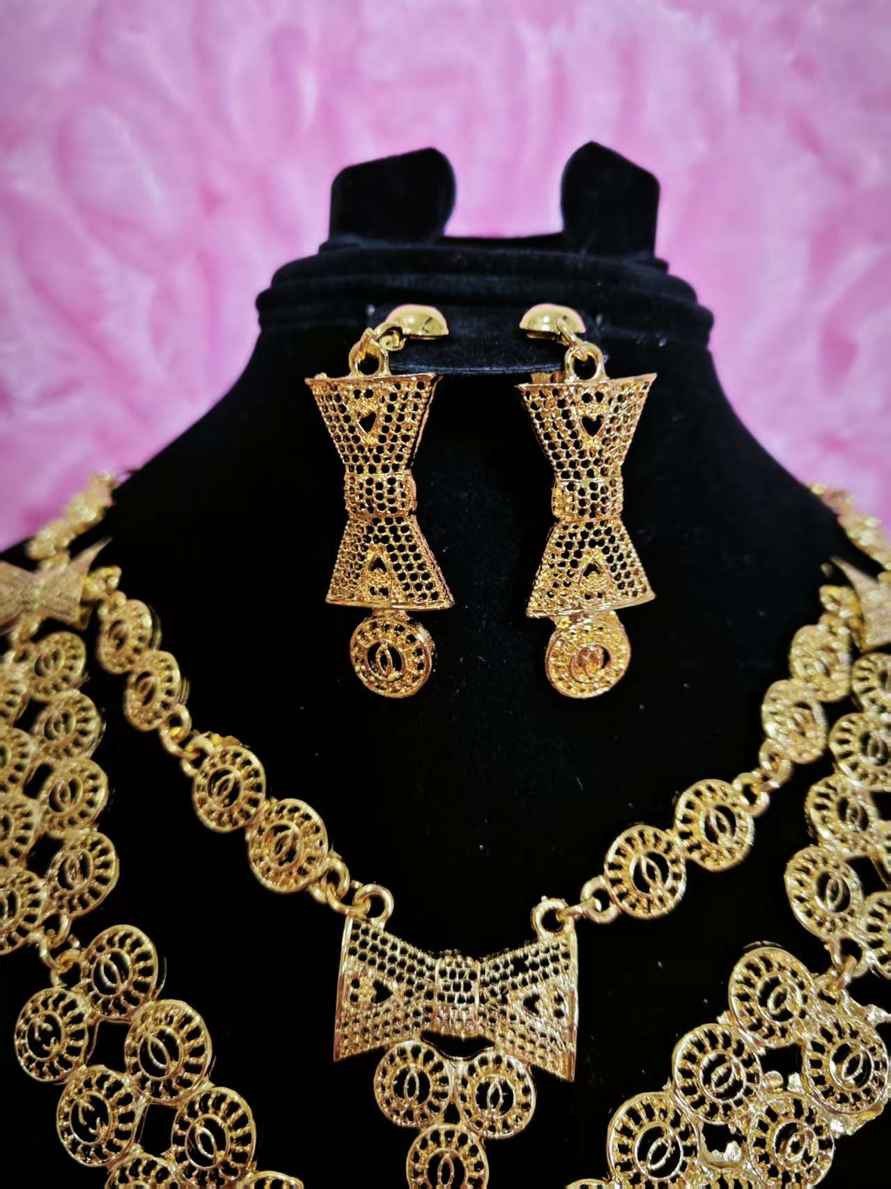 It adopts the Middle Eastern lace hollow heavy industry gilded jewelry set design (three-dimensional and complex shape with Middle Eastern retro artistic sense), highlighted by "lace hollow grid + multi-layer chain layering". The combination of "matte gilded gold metal luster + texture hierarchy of lace hollow" creates a "Middle Eastern heavy industry + retro artistic style" with fine lace weaving texture and calm gilded color. The two-piece set of necklace + earrings has a "retro ritual sense filter", and the shape is suitable for various retro style scenarios such as Middle Eastern folk celebrations, exotic theme weddings and retro luxury dinners, making it the "retro core" of the outfit.