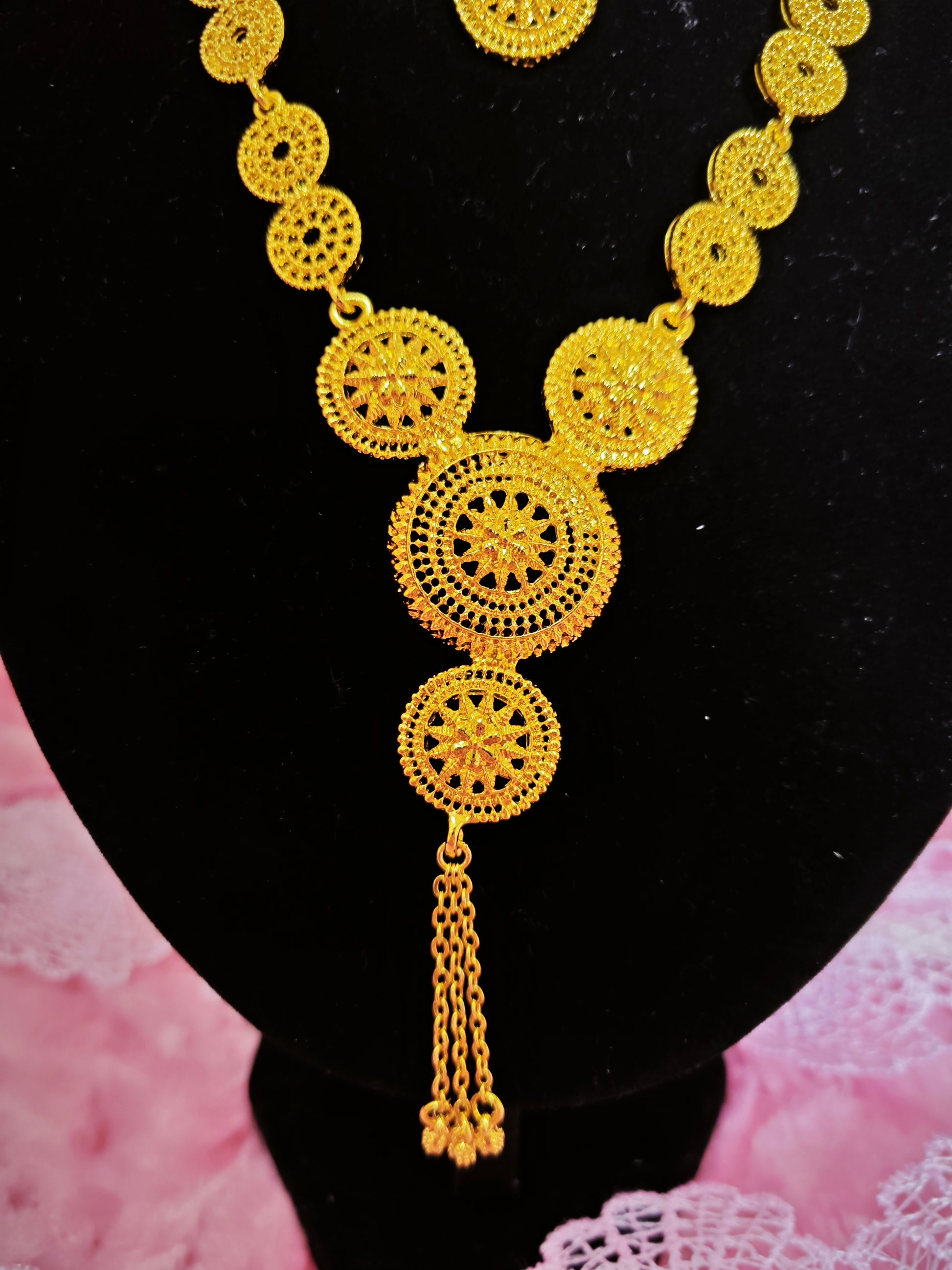 This two-piece set (necklace + earrings) adopts the design of Middle Eastern filigree hollow heavy industry gilded jewelry, with a light, transparent shape full of Middle Eastern artistic sense. Highlighted by "filigree hollow flower shape + multi-layer chain layering", the combination of bright gilded yellow metal luster and the texture of filigree hollow creates a strong fusion style of Middle Eastern filigree and exotic art. The set has an artistic ritual sense and is the core decorative highlight of the outfit for various artistic scenarios.