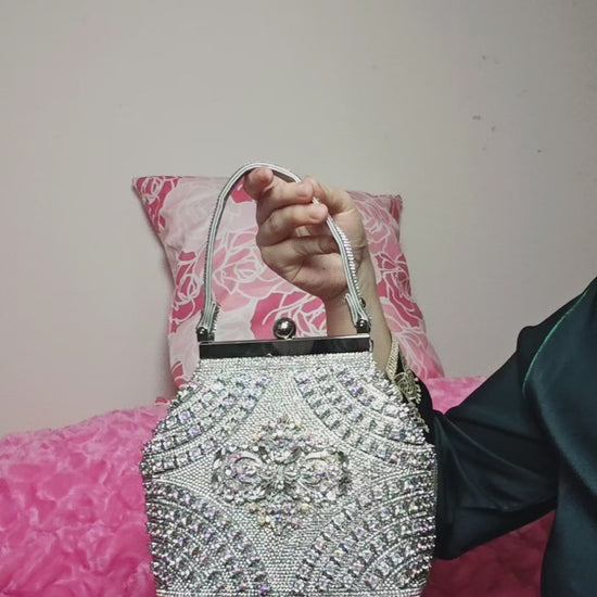 Crafted with high-quality full diamond inlay technology and wear-resistant silver leather base, the bag body features a fairy luxury and dazzling visual effect with full-paved iridescent silver rhinestones and large crystal diamond totem dense inlay technology. The hand strap adopts silver diamond inlaid leather technology (smooth touch and firm diamond surface without falling off), and the metal edging and lock adopt electroplated bright silver technology for anti-oxidation and non-fading. The rhinestones are inlaid with firm hand dense setting technology, and the iridescent silver rhinestones and crystal diamond totems are arranged in layers and not easy to fall off. The leather base has both scratch-resistant and wear-resistant properties, which not only retains the gorgeous and shiny texture of the clutch bag, but also can maintain a delicate shape for a long time after multiple uses.