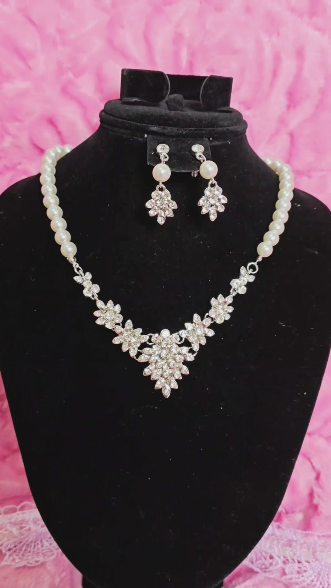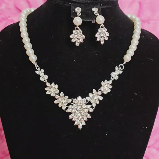 Silver Pearl & Crystal Floral Statement Necklace & Earring Set