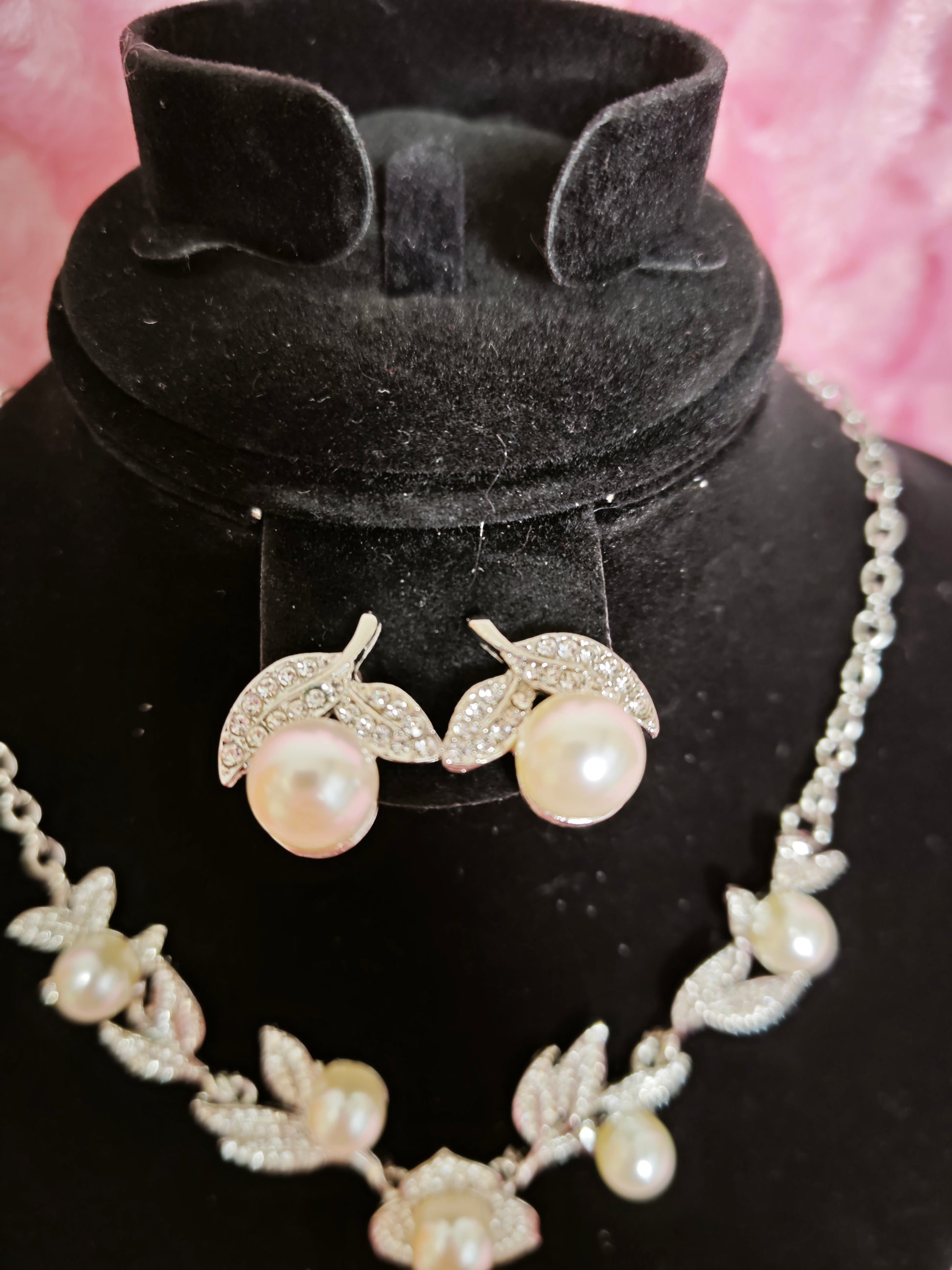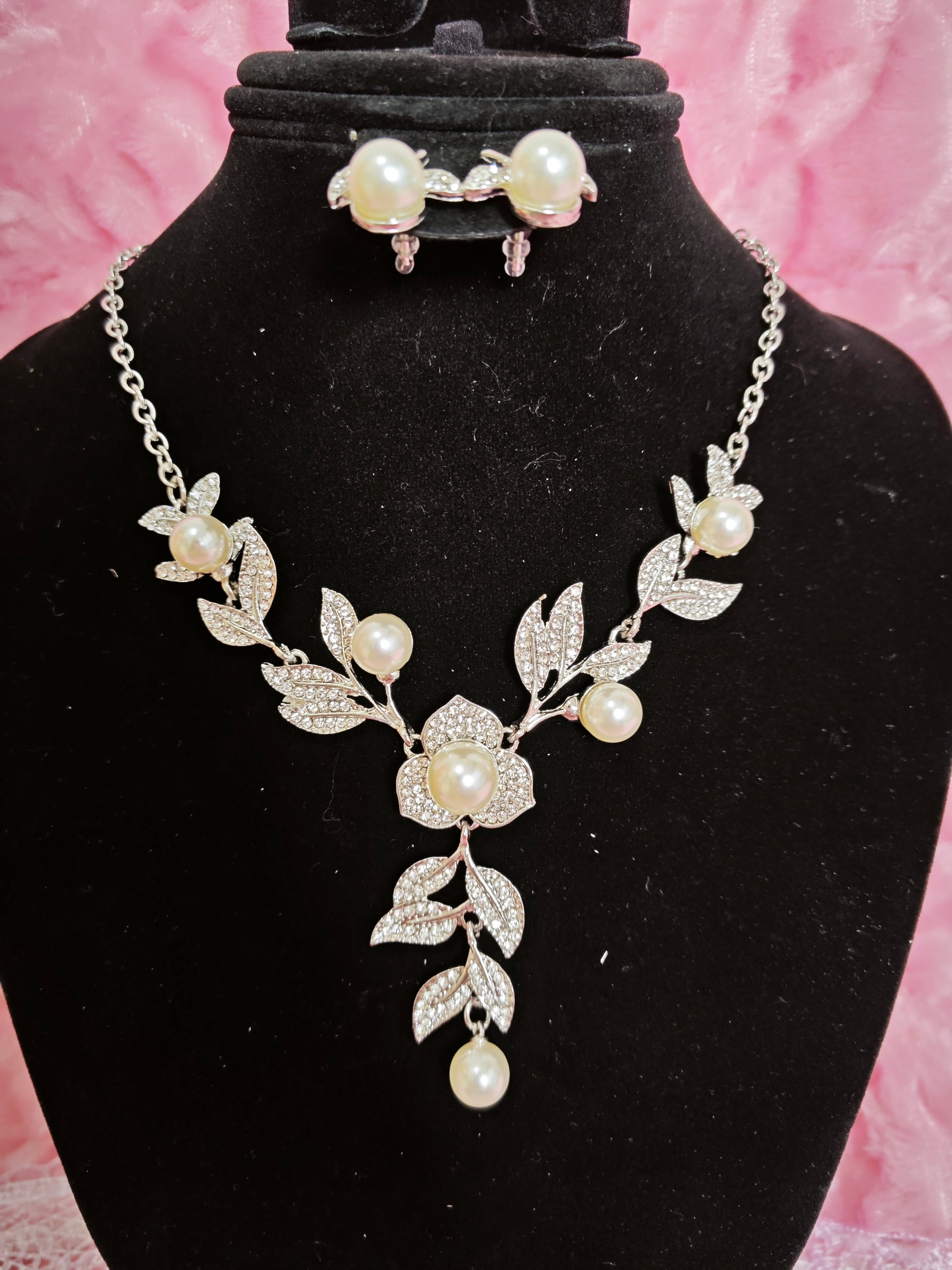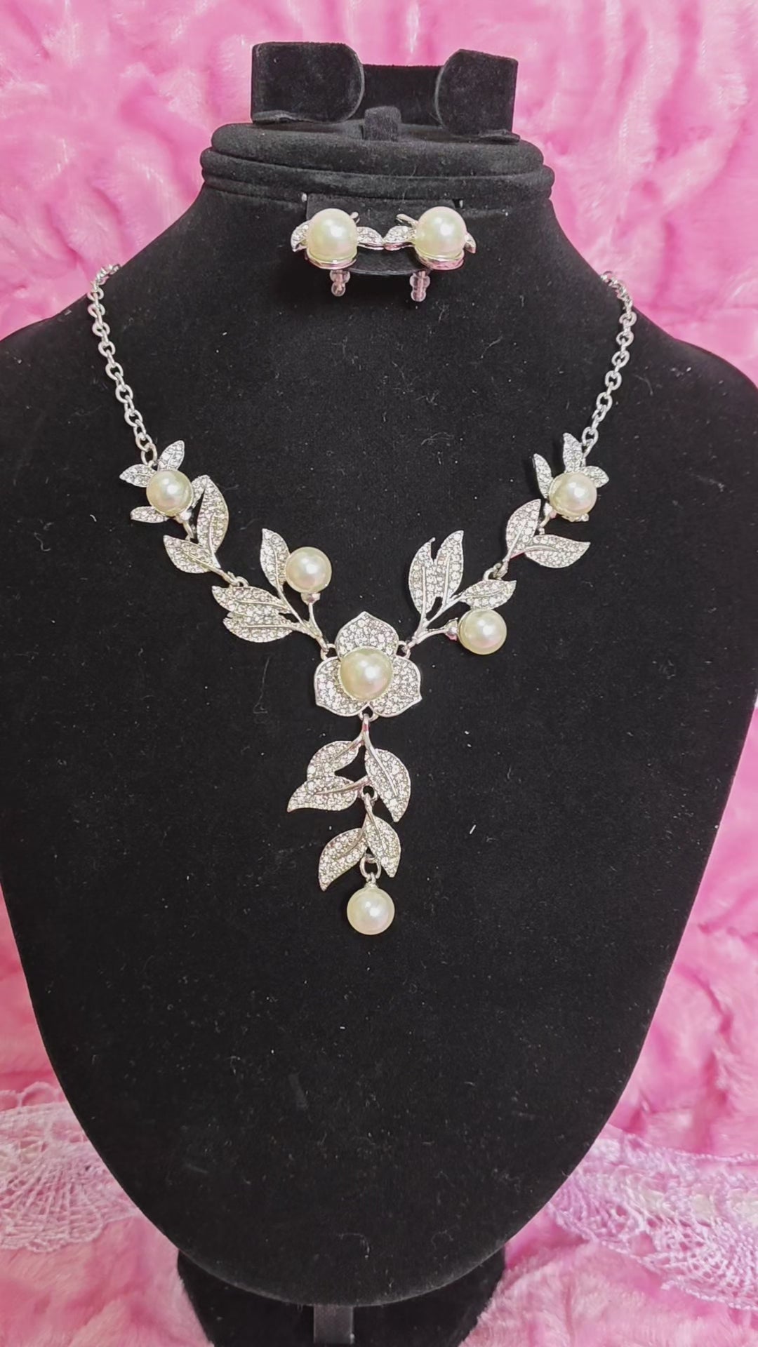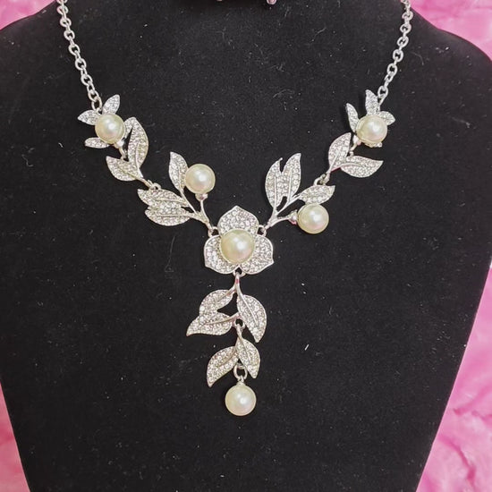 Silver Pearl & Crystal Leaf-Flower Necklace & Earring Set