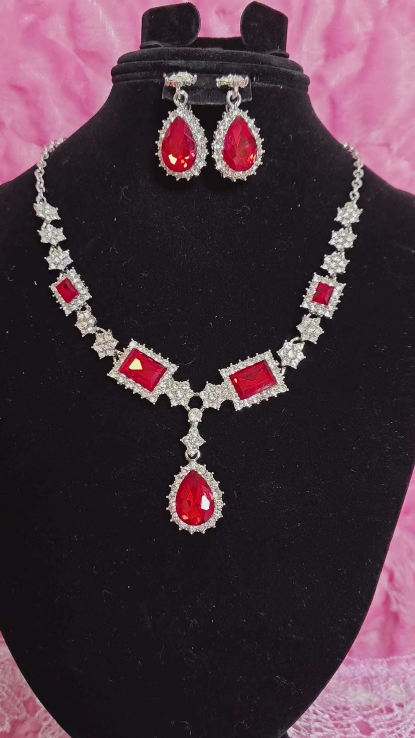 Silver Red Crystal & Diamond Geometric Necklace & Earring Set