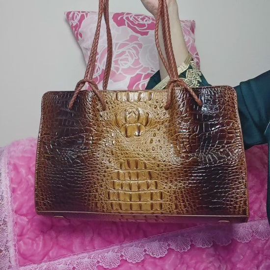It features a classic handheld tote bag silhouette (straight and magnificent lines, simple bag outline), highlighted by "gradient crocodile pattern texture + metal hardware + woven handle". The combination of "coffee gold gradient base + three-dimensional crocodile pattern + woven handle" creates a "retro light luxury European and American style" with the gorgeous gradient tone and domineering crocodile pattern details. The coffee gold gradient bag has an "eye-catching and high-grade filter", and the tote bag shape is suitable for commuting, gatherings, traveling and other style scenarios, making it an "elegant texture highlight" for outfits.