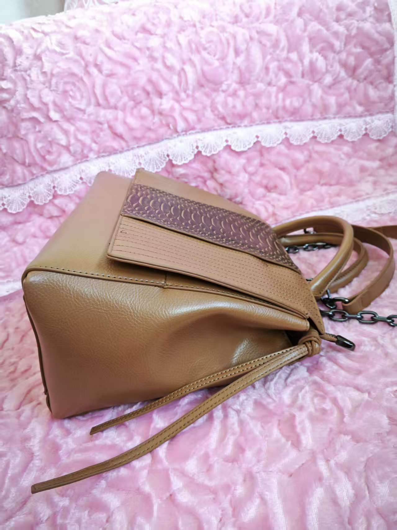 Sleek 3D tote silhouette (neat and elegant lines), paired with "double texture splicing + matching body" as accents—it combines "warm caramel brown + double texture splicing"; the gentle texture of caramel brown collides with the retro tension of textures to create a "retro light luxury commuter vibe"; the caramel brown bag body comes with a "high-quality texture filter," suiting intellectual/casual style scenarios as a "retro texture anchor" for outfits.