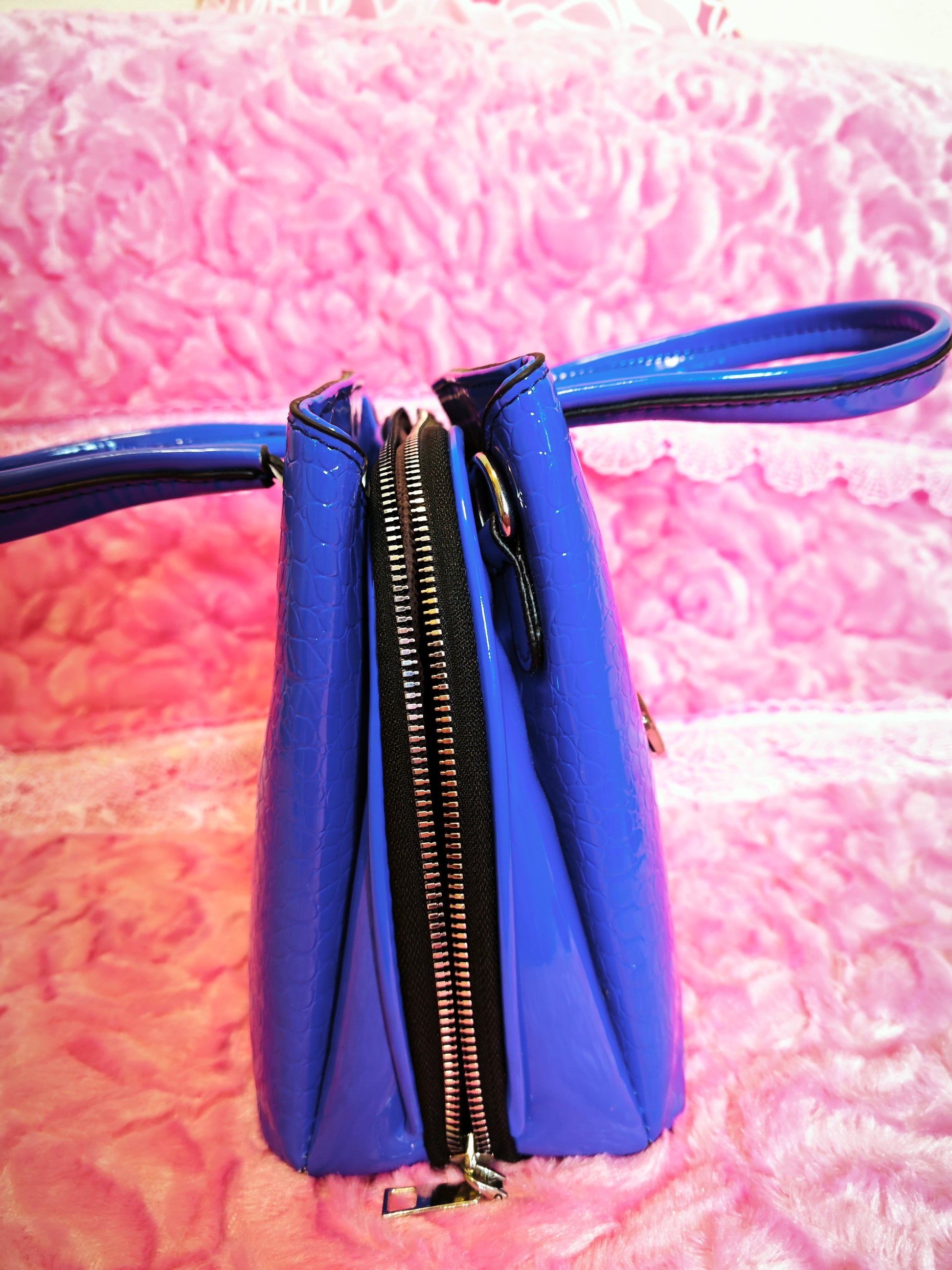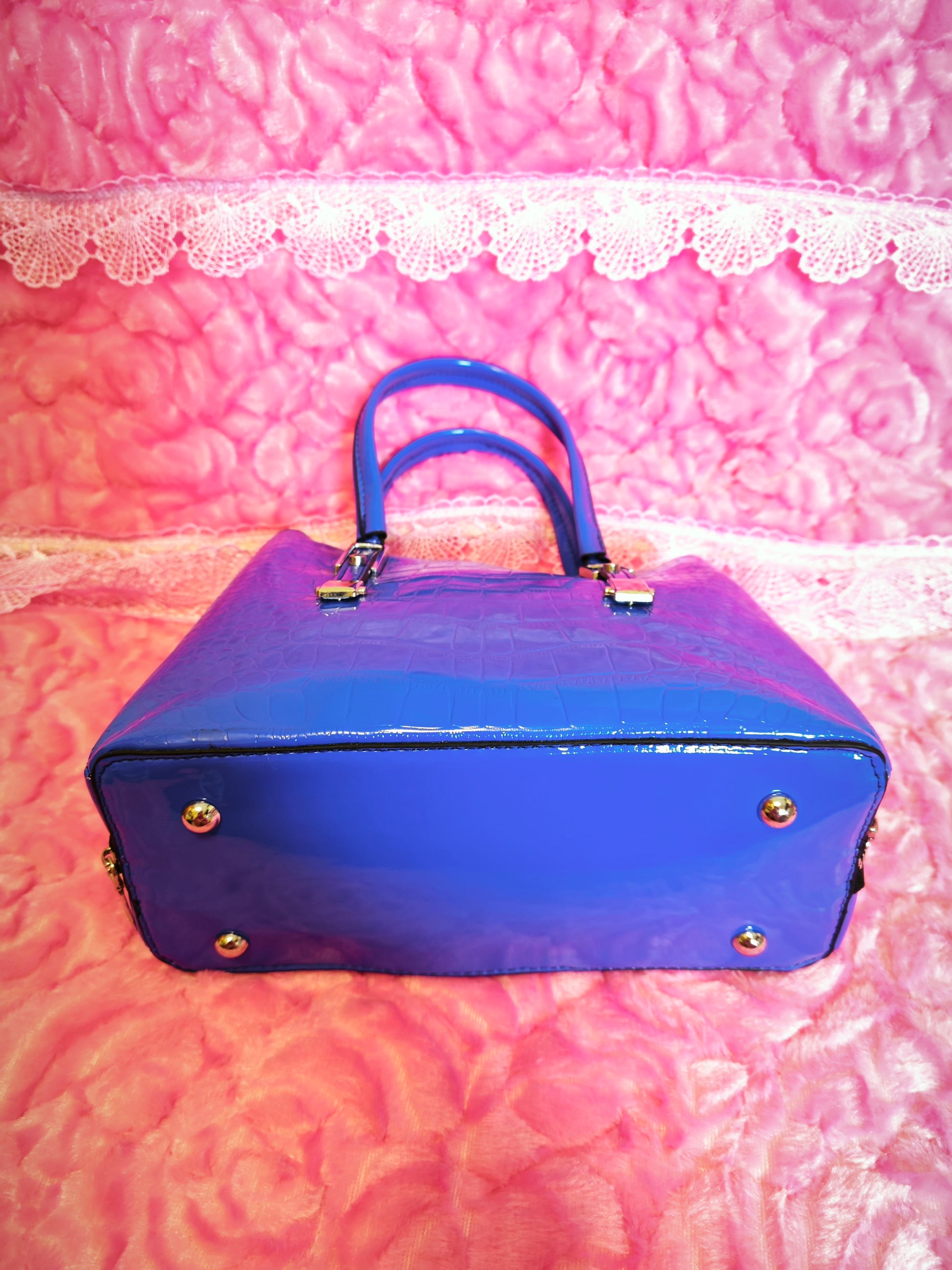 Bright Blue Patent Crocodile-Print Handbag with Metal Accents