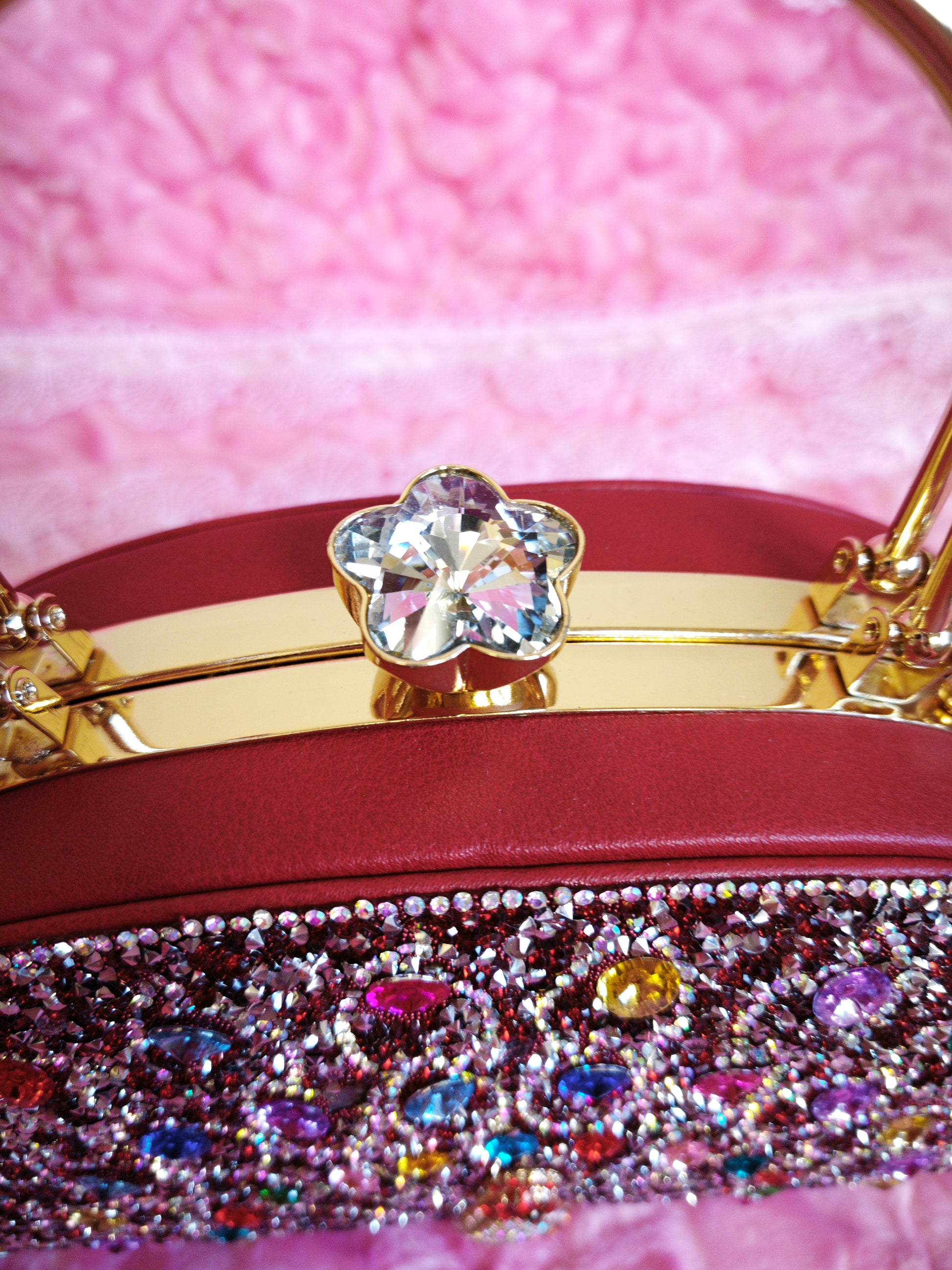 It features a classic semicircular bowling bag silhouette (round and plump lines, simple and elegant outline with inherent magnificent style), highlighted by "burgundy diamond peacock pattern + burgundy leather + flower-shaped crystal hardware buckle". The combination of "burgundy diamond peacock pattern + burgundy leather background" creates a "magnificent celebrity dinner style" with rich burgundy diamond luster and bright colorful diamond texture. The semicircular bowling bag has an "eye-catching focal filter", and the bag shape is suitable for high-end banquets, Chinese weddings, red carpets, annual meetings and other formal style scenarios, making it a "luxurious highlight" for outfits.