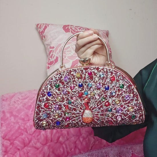 Burgundy-Base Multi-Colored Crystal Peacock-Pattern Evening Handbag