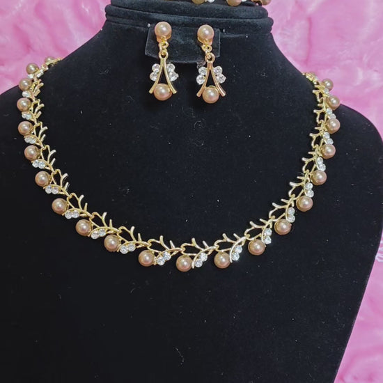 It features a classic elegant dinner jewelry set silhouette (soft and vivid lines), highlighted by "apricot pearl main ornaments + transparent white diamond inlay + vine necklace design". The combination of "soft apricot pearl base + shiny white diamond border" creates a "French elegant dinner style" with warm pearl texture and bright gold metal luster. The three-piece set of vine necklace + stud earrings + bracelet has a "gentle atmosphere filter", and the shape is suitable for banquets, parties, annual meetings, wedding dress styling and other formal style scenarios, making it an "elegant highlight" for outfits.