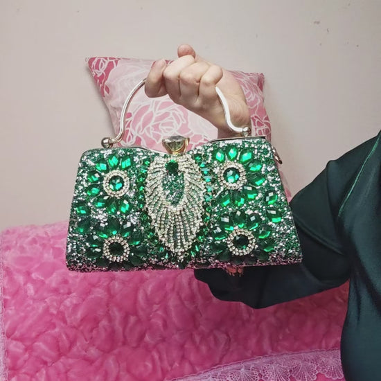 Emerald Green & Gold Crystal Fan-Pattern Evening Handbag