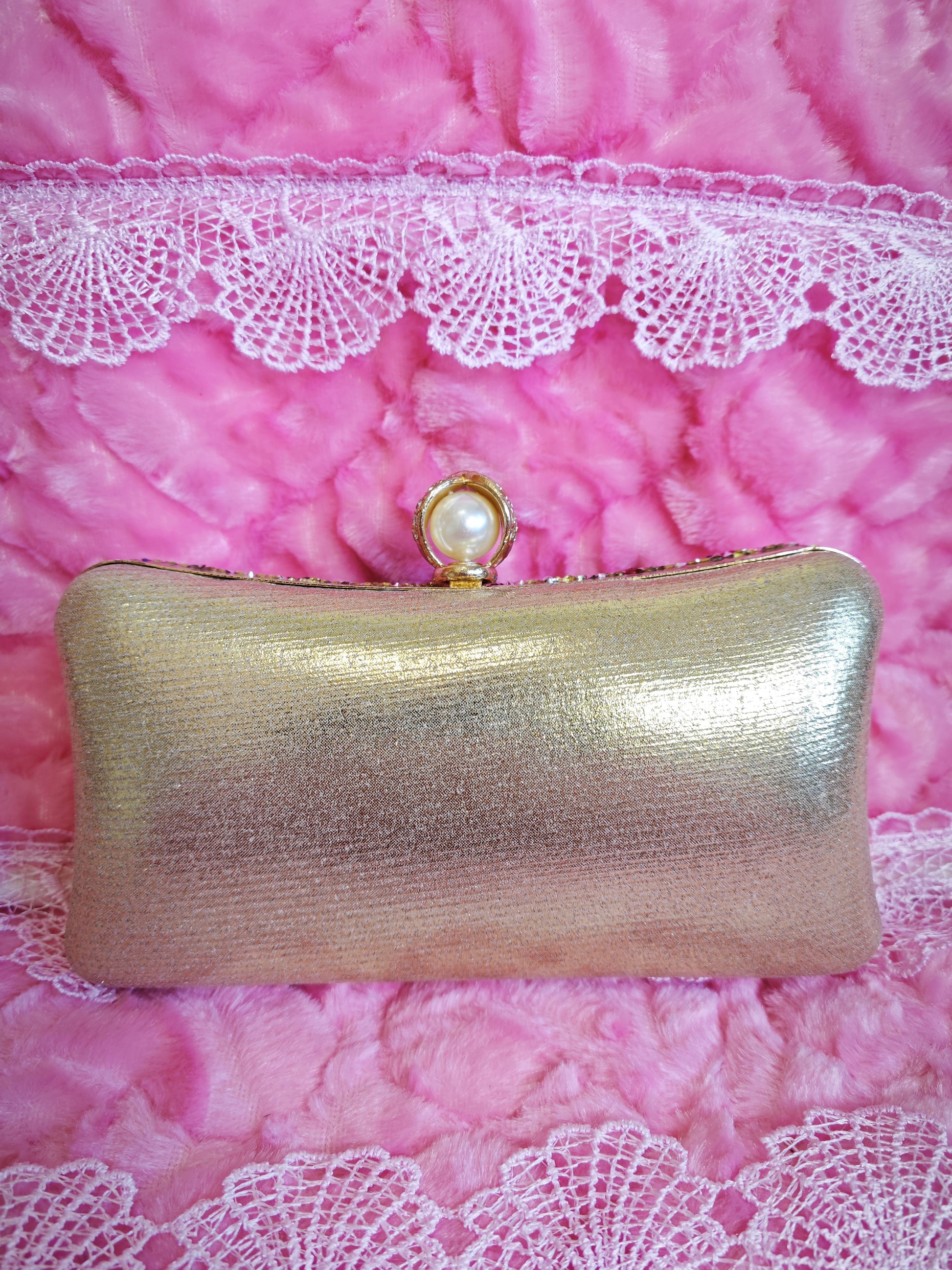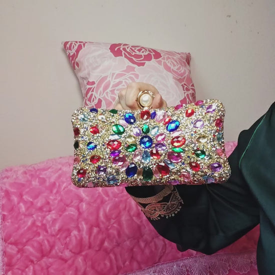 Gold-Base Multi-Colored Crystal & Pearl-Clasp Evening Clutch