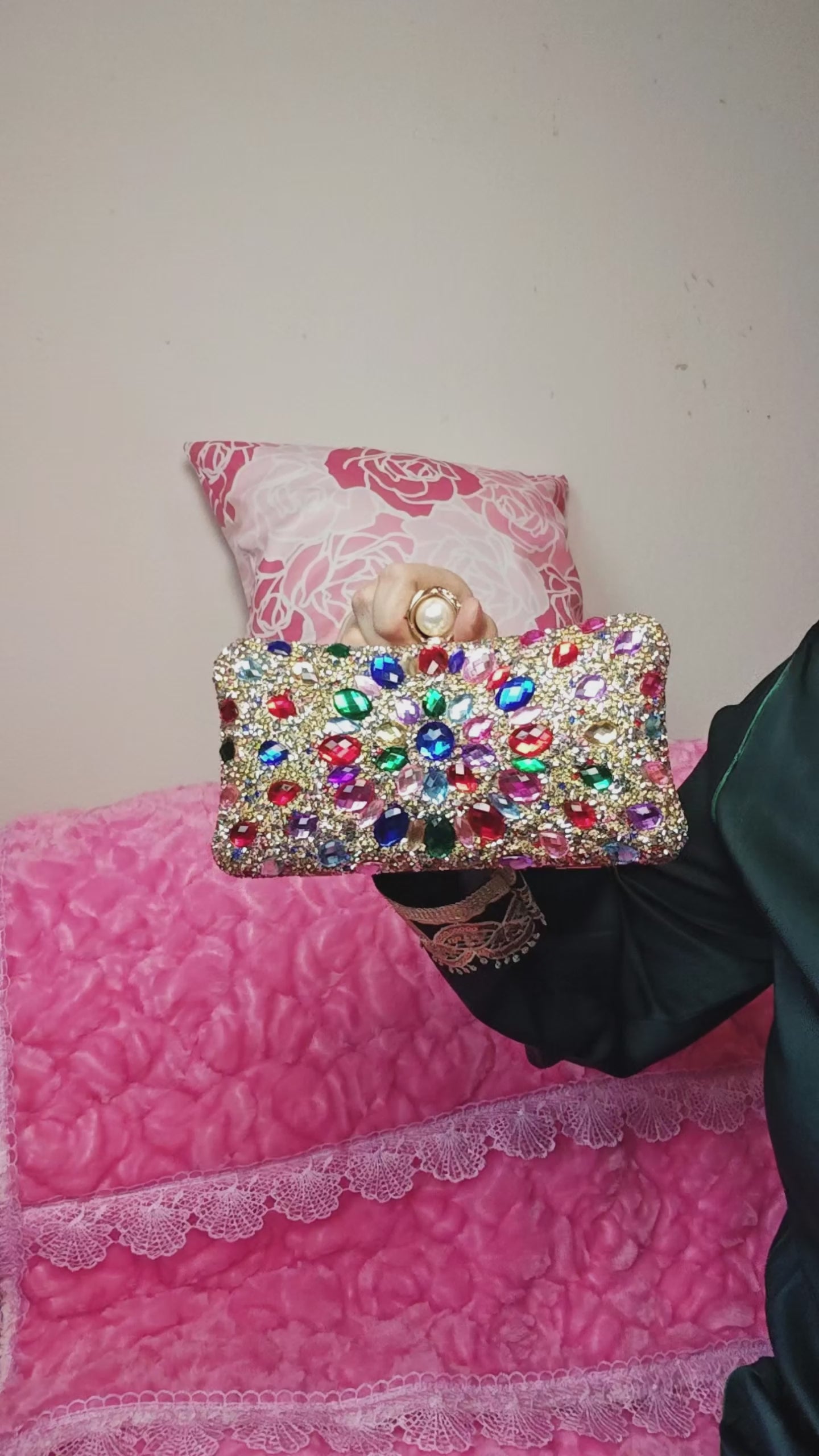 Crafted with high-quality colorful irregular diamond dense setting technology and delicate champagne gold pearlescent fabric, the front features a gorgeous and dazzling visual effect with full-paved large colorful irregular diamonds and champagne gold crushed diamond dense paving technology. The side is made of champagne gold pearlescent textured fabric (smooth touch with warm metallic luster), and the metal edging adopts electroplated real gold technology for anti-oxidation and non-fading. The rhinestones are inlaid with firm handcraft, not easy to fall off. The pearlescent fabric has both scratch-resistant and anti-snagging properties, which not only retains the luxurious and shiny texture of the clutch bag, but also can maintain a delicate shape for a long time in daily use.