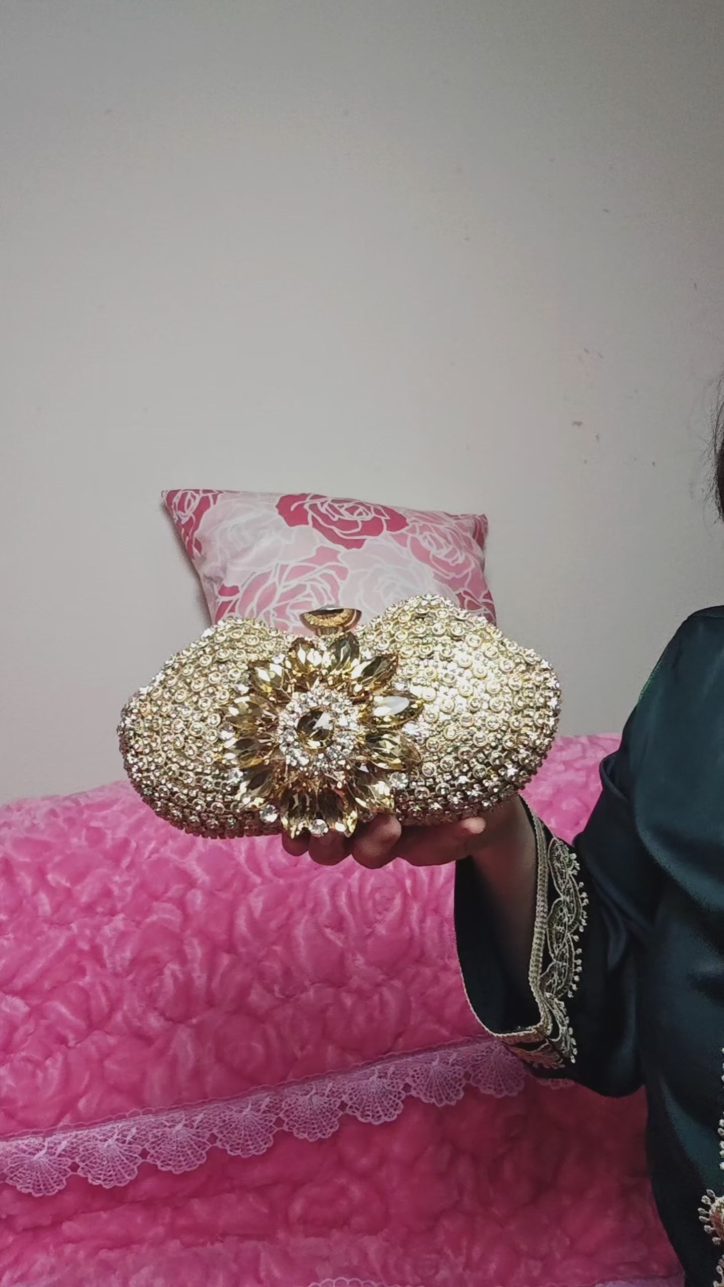 It features a classic cloud-shaped clutch bag silhouette (soft and smooth lines, the outline is as vivid and three-dimensional as a cloud), highlighted by "full diamond inlay + champagne gold pearlescent fabric + round crystal hardware buckle". The combination of "champagne gold diamond flower totem + champagne gold pearlescent base" creates a "magnificent celebrity dinner style" with noble gold diamond luster and soft pearlescent texture. The cloud-shaped bag has an "eye-catching atmosphere filter", and the clutch bag shape is suitable for banquets, parties, annual meetings and other formal style scenarios, making it a "luxurious highlight" for outfits.