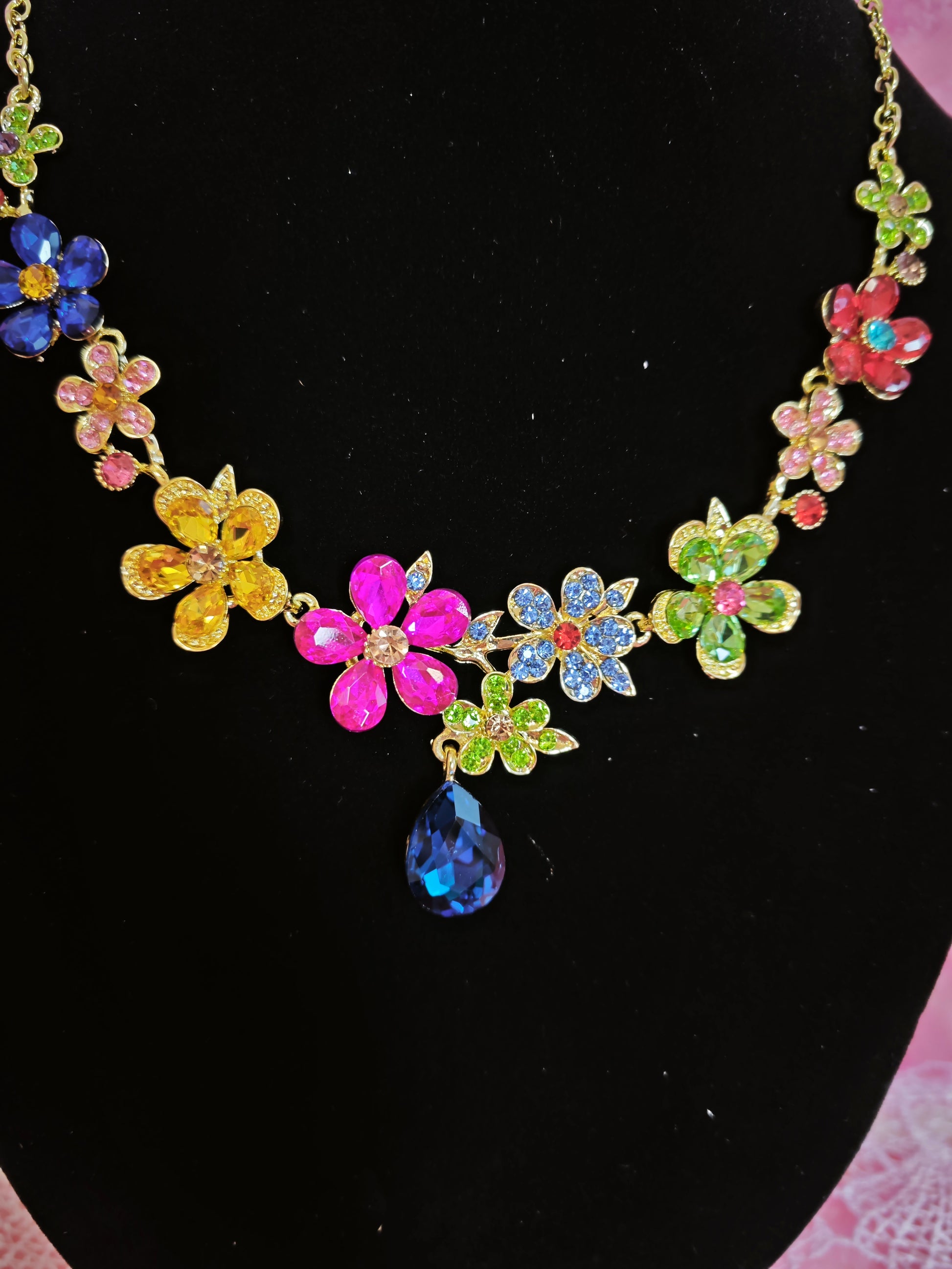 It features a classic flower-shaped dinner jewelry set (vivid and gorgeous lines), highlighted by "colorful rhinestone flowers + teardrop sapphire rhinestone pendant + necklace design". The combination of "colorful rhinestone base + shiny small rhinestone border + sapphire main stone color contrast" creates a "gorgeous light luxury dinner style" with three-dimensional flower texture and bright gold metal luster. The combination of flower necklace + stud earrings has an "eye-catching atmosphere filter", and the shape is suitable for banquets, parties, annual meetings, stage performances and other formal style scenarios, making it a "gorgeous highlight" for outfits.