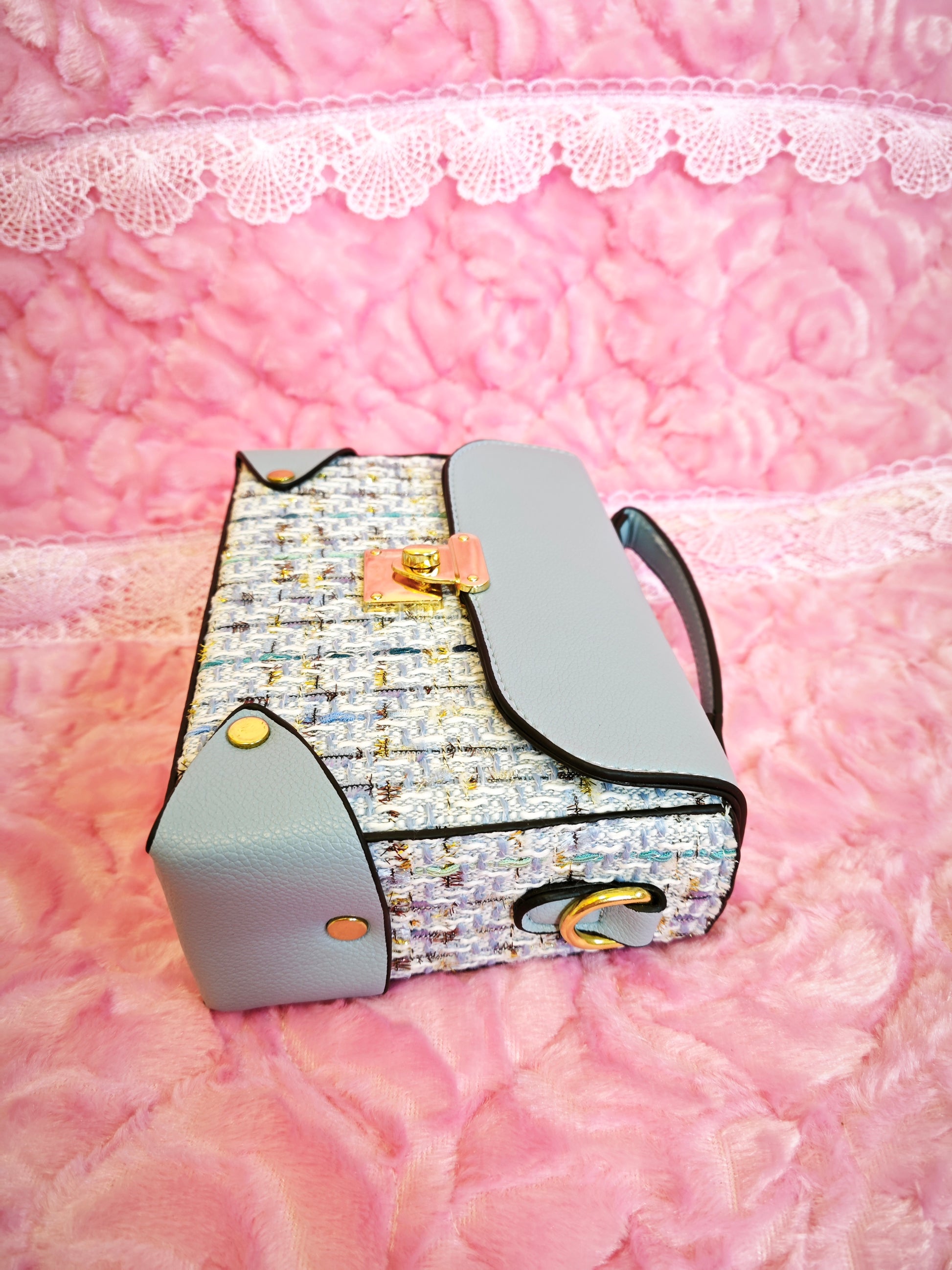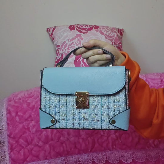 Light Blue & Tweed Handbag with Metal Lock & Wide Strap