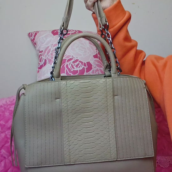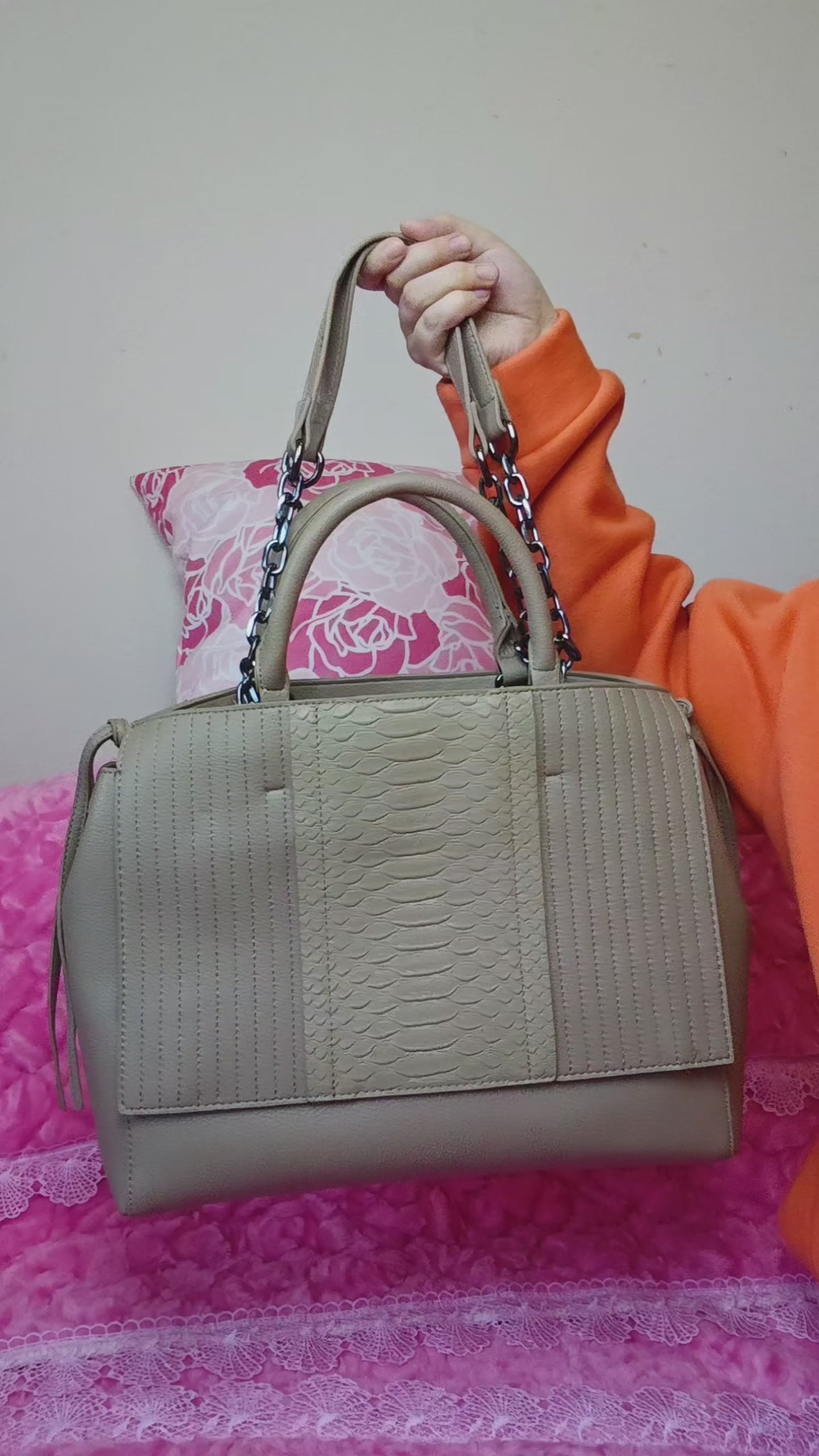 Sleek 3D tote silhouette (smooth and neat lines), paired with "crocodile pattern splicing + metal chain" as accents—it combines "soft mist light khaki base + 3D crocodile pattern splicing + chain decoration"; the gentle texture of light khaki collides with the retro tension of crocodile patterns to create a "retro light luxury commuter vibe"; the light khaki bag body comes with an "elegant high-end filter," suiting intellectual/casual style scenarios as a "gentle texture anchor" for outfits.
