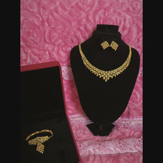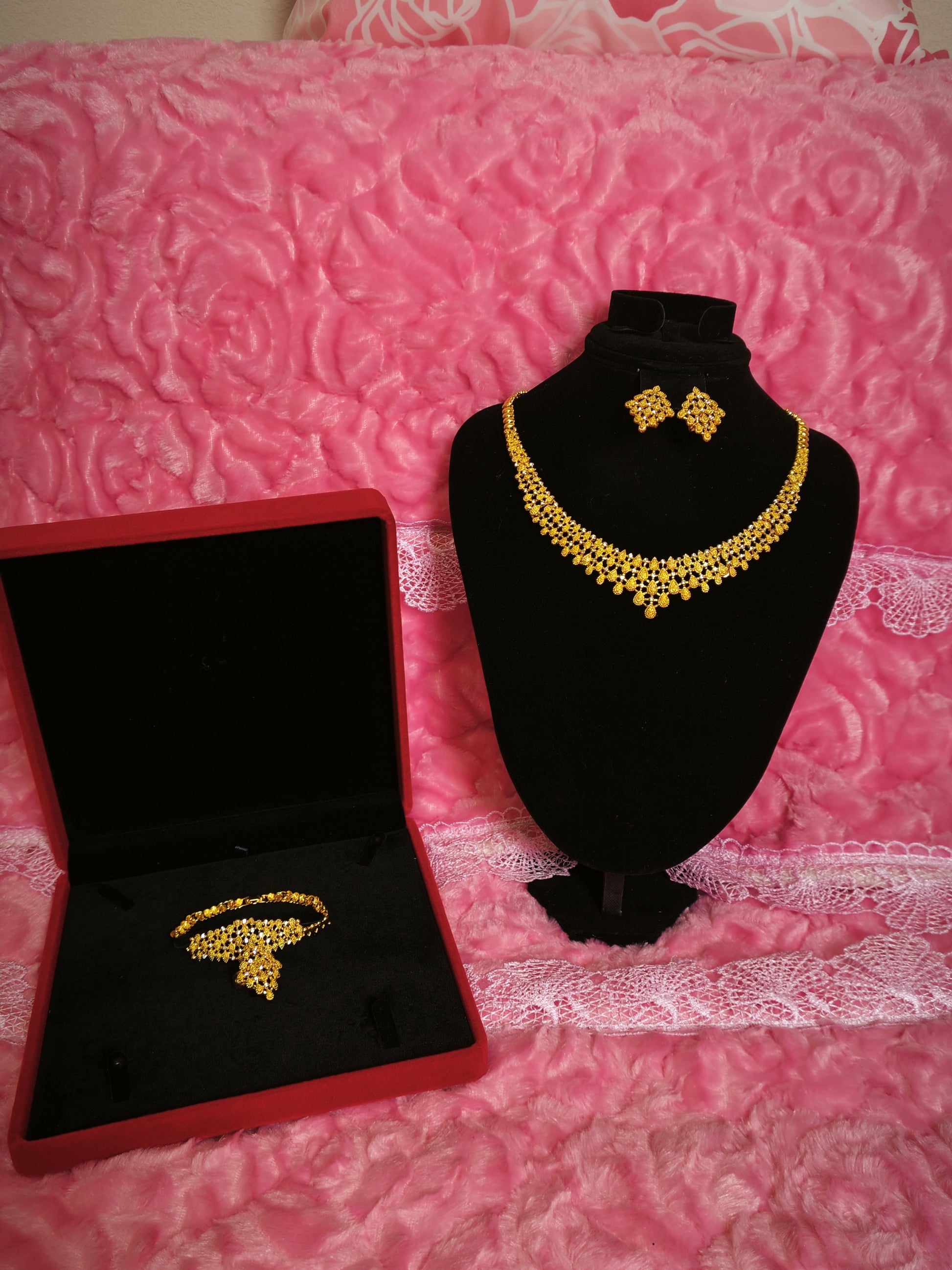 It adopts the Middle Eastern light luxury gilded jewelry set design (fine and three-dimensional lines with a Middle Eastern elegant sense), highlighted by "filigree dense weaving base + white diamond micro-setting decoration". The combination of "gilded bright yellow metal luster + white diamond white flash color contrast" creates a "Middle Eastern light luxury + exotic elegant style" with delicate filigree weaving texture and full gilded color. The four-piece set of necklace + bracelet + earrings + ring has an "exquisite ritual sense filter", and the shape is suitable for Middle Eastern cultural celebrations, exotic light luxury weddings, high-end theme dinners and other exquisite style scenarios, making it the "elegant highlight" of the outfit.