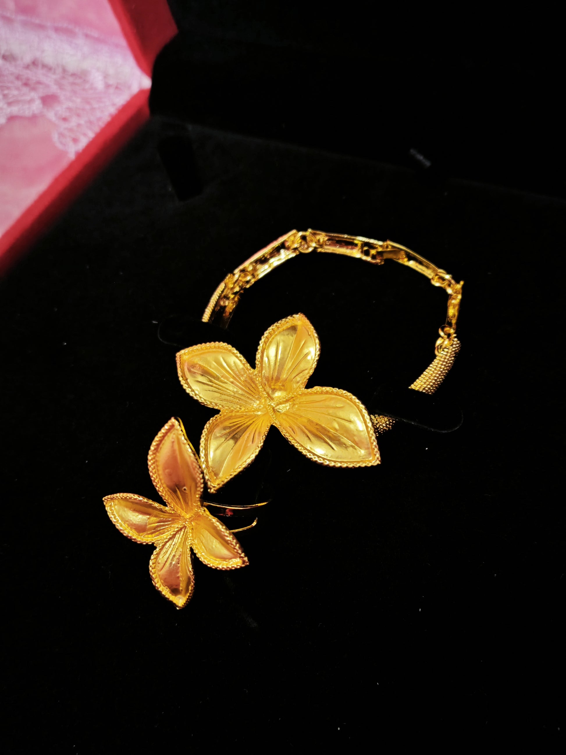It adopts the Middle Eastern floral heavy industry gilded jewelry set design (three-dimensional and full shape with a Middle Eastern royal sense), highlighted by "three-dimensional floral embossment + minimalist gilded base". The combination of "gilded bright yellow metal luster + texture hierarchy of floral embossment" creates a "Middle Eastern royal + light luxury floral style" with delicate polishing texture and full floral shape. The three-piece set of necklace + bracelet + ring has a "luxurious ritual sense filter", and the shape is suitable for Middle Eastern high-end weddings, royal-style celebrations, luxury theme dinners and other luxurious style scenarios, making it the "royal texture representative" of the outfit.