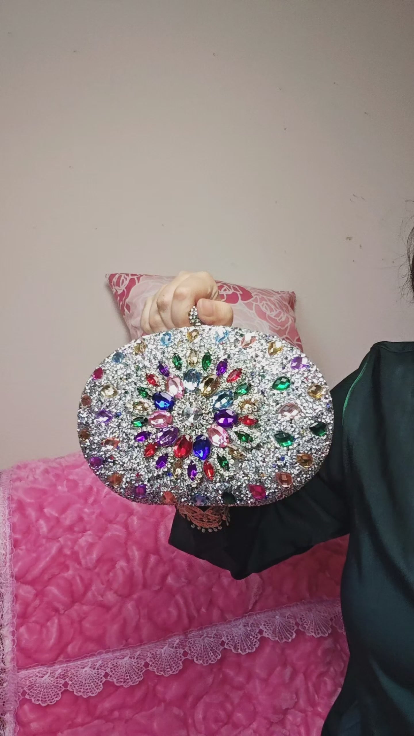 It features a classic oval clutch bag silhouette (round and elegant lines), highlighted by "full diamond inlay + pearlescent fabric + metal hardware". The combination of "colored diamond patchwork + silver pearlescent base" creates a "light luxury celebrity dinner style" with gorgeous diamond colors and soft pearlescent texture. The oval bag has an "eye-catching atmosphere filter", and the clutch bag shape is suitable for banquets, parties, annual meetings and other formal style scenarios, making it a "luxurious highlight" for outfits.