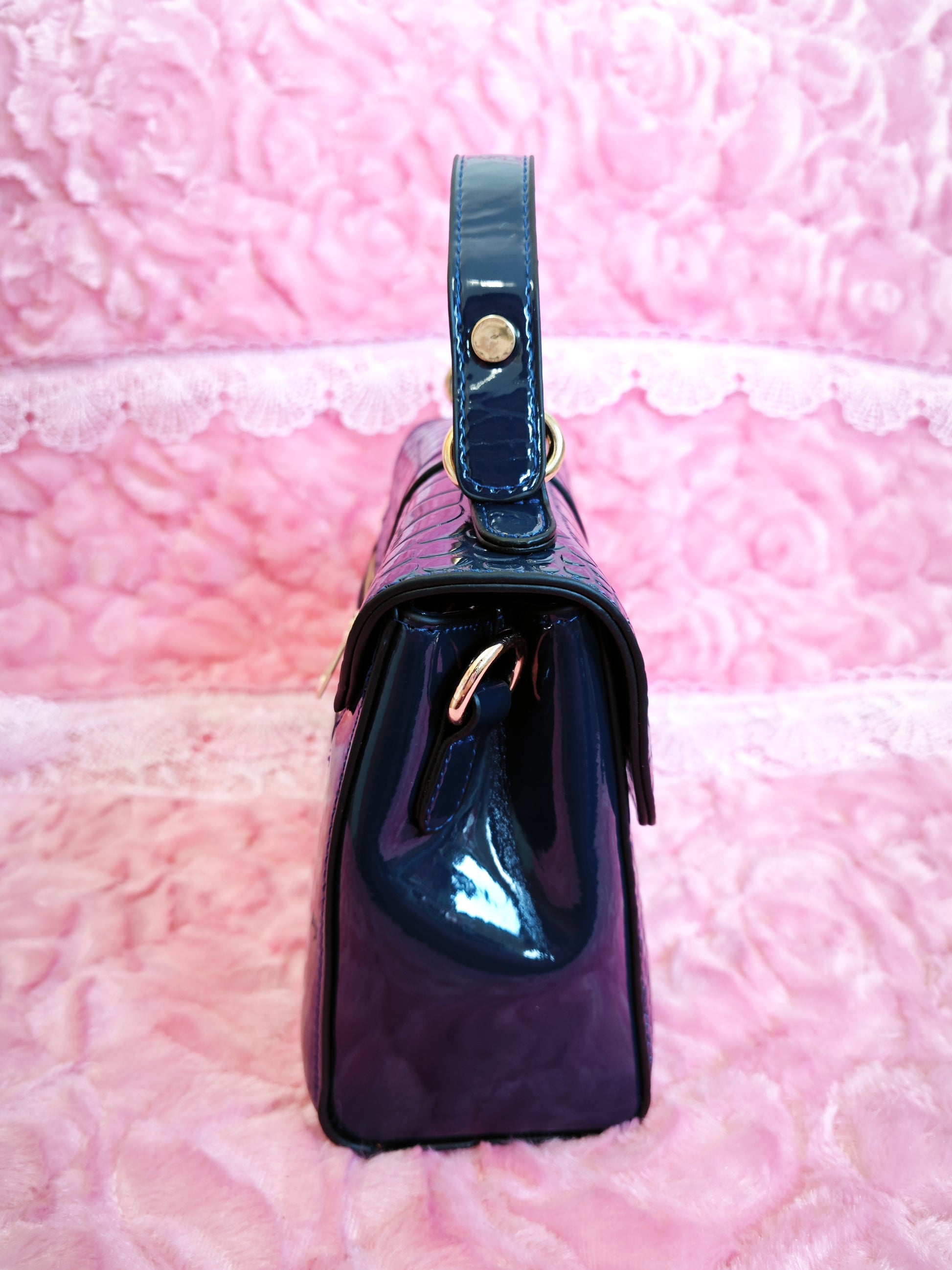 Navy Patent Crocodile-Print Handbag with Metal Lock