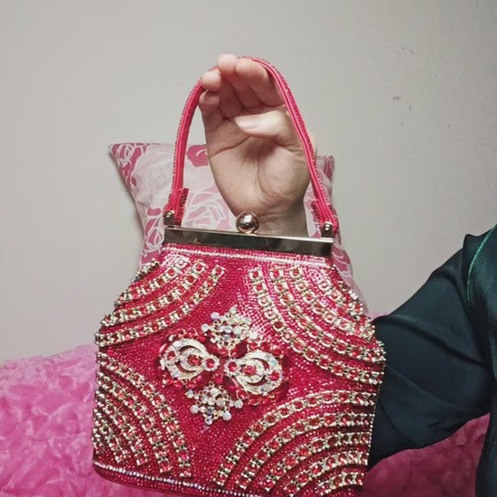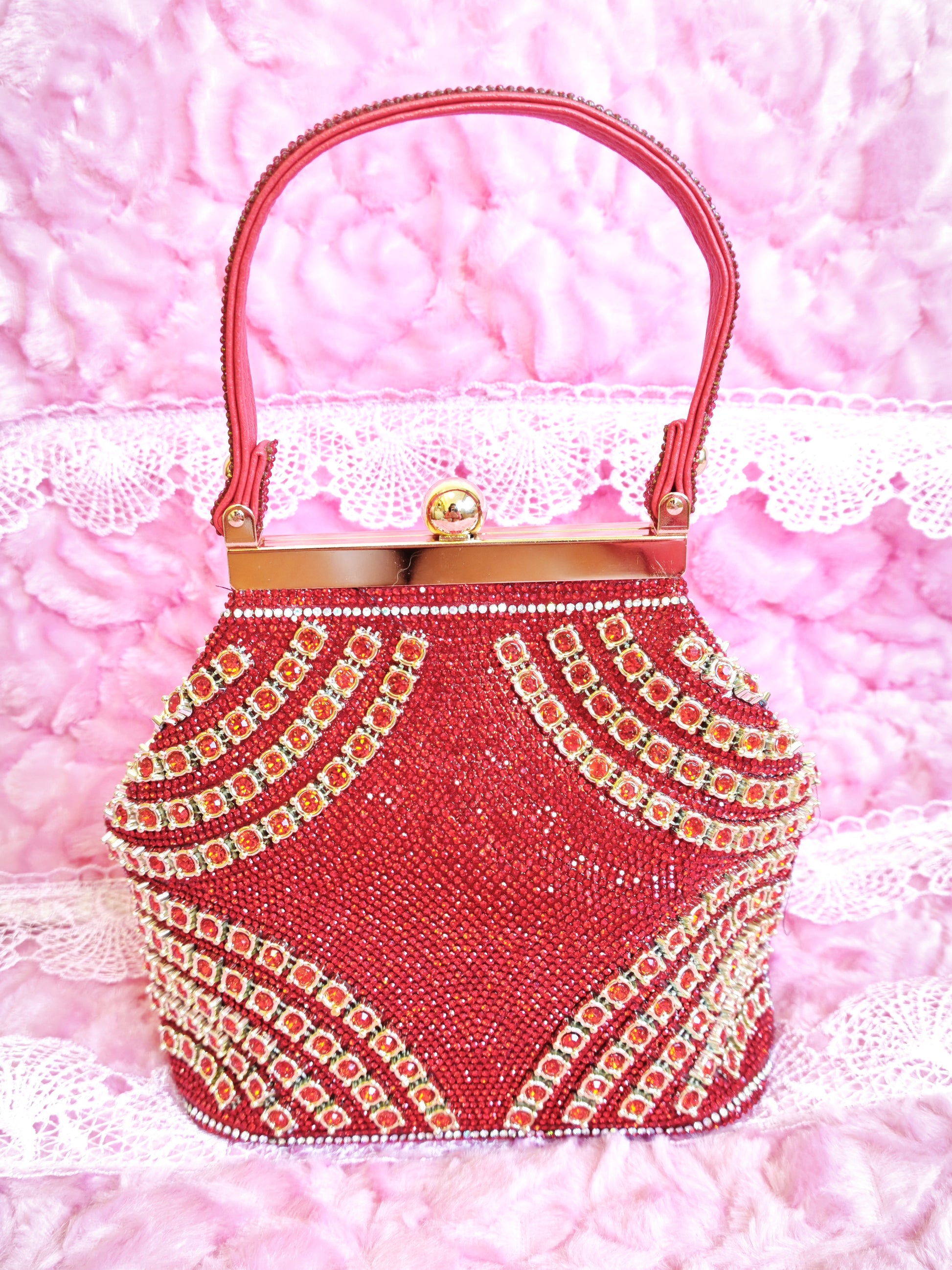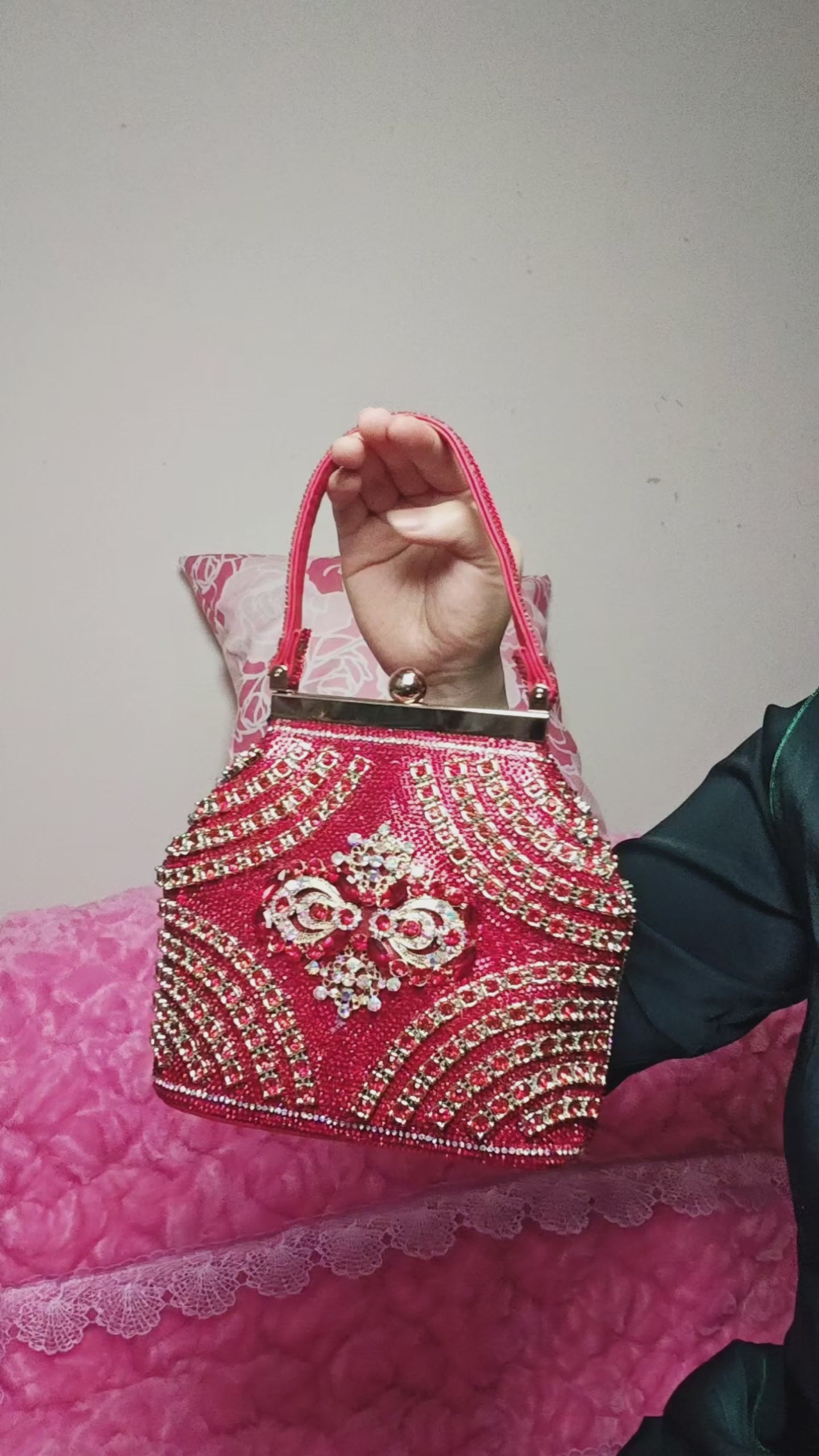 It features a classic trapezoidal clutch bag silhouette (neat and magnificent lines, three-dimensional and straight outline), highlighted by "full bright red diamond inlay + red leather base + pearl lock hardware". The combination of "bright red diamond totem + red gold leather background" creates a "festive luxury dinner style" with rich bright red diamond luster and festive leather texture. The trapezoidal bag has an "eye-catching focal filter", and the clutch bag shape is suitable for high-end banquets, Chinese weddings, red carpets, annual meetings and other formal style scenarios, making it a "festive highlight" for outfits.