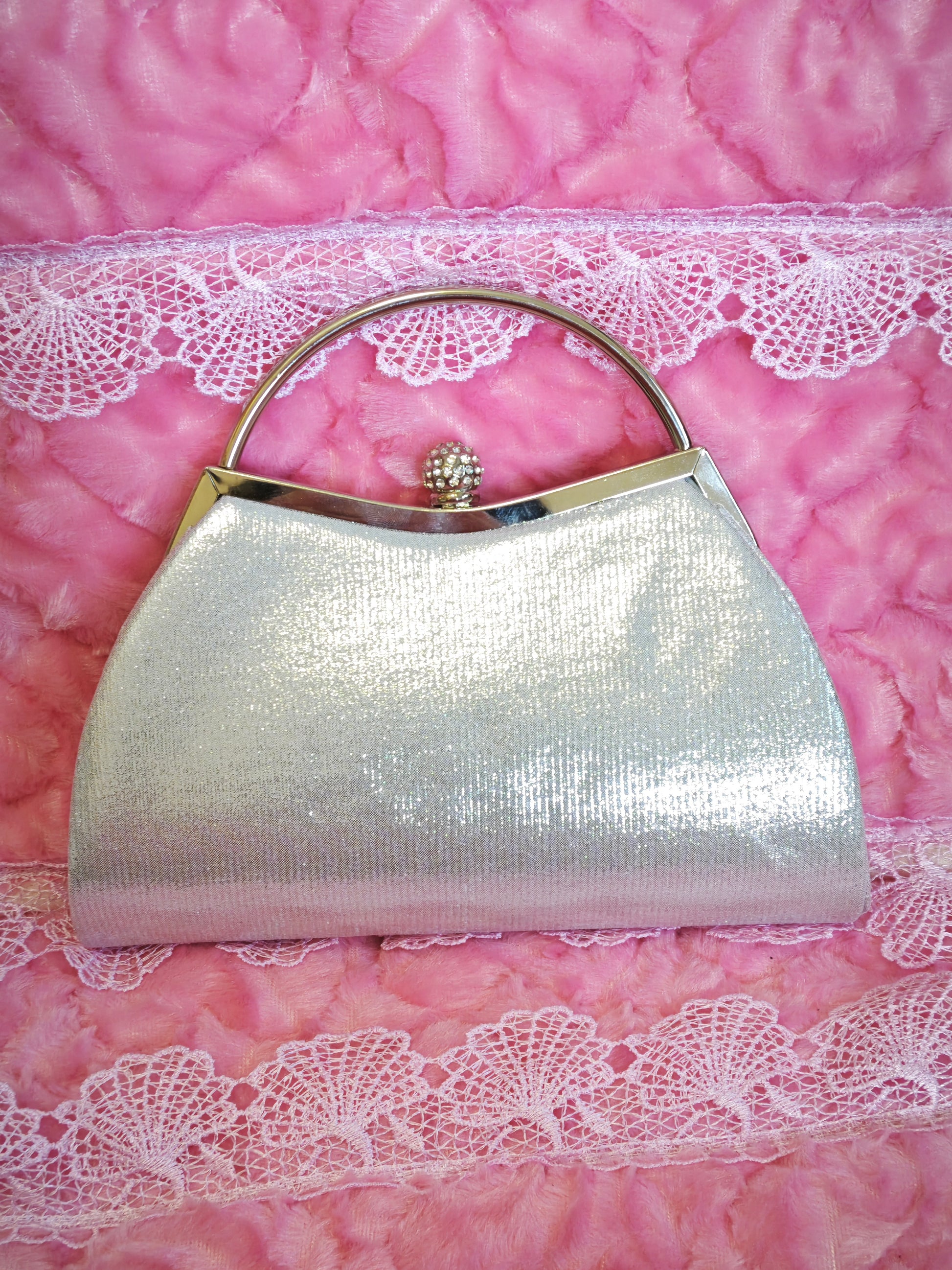 Crafted with high-quality diamond-setting technology and delicate silver pearlescent fabric, the front features a shining and dazzling effect with full-paved white diamonds and large crystal diamond radial dense setting technology. The side is made of silver pearlescent textured fabric (smooth touch with cold high-grade metallic luster), and the metal edging and hand ring adopt electroplated bright silver technology for anti-oxidation and non-fading. The rhinestones are inlaid with firm hand dense setting technology, and the white diamonds and crystal diamonds are arranged in layers and not easy to fall off. The pearlescent fabric has both scratch-resistant and anti-snagging properties, which not only retains the light luxury and shining texture of the clutch bag, but also can maintain a delicate shape for a long time after multiple uses.
