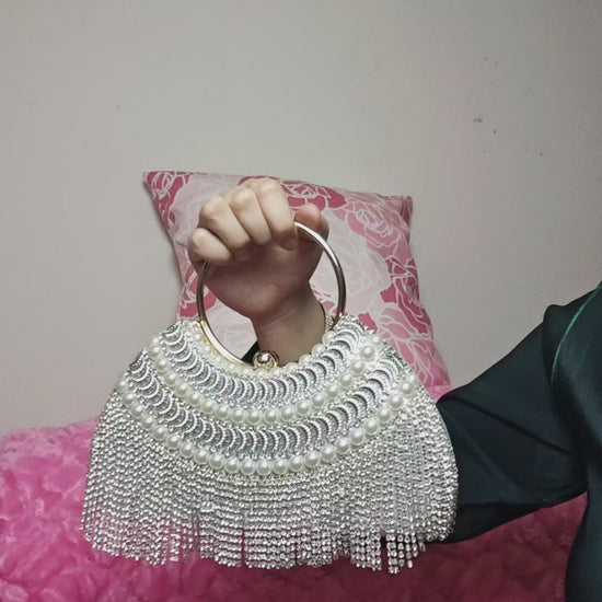 Silver Crystal & Pearl-Embellished Evening Handbag with Metal Handle