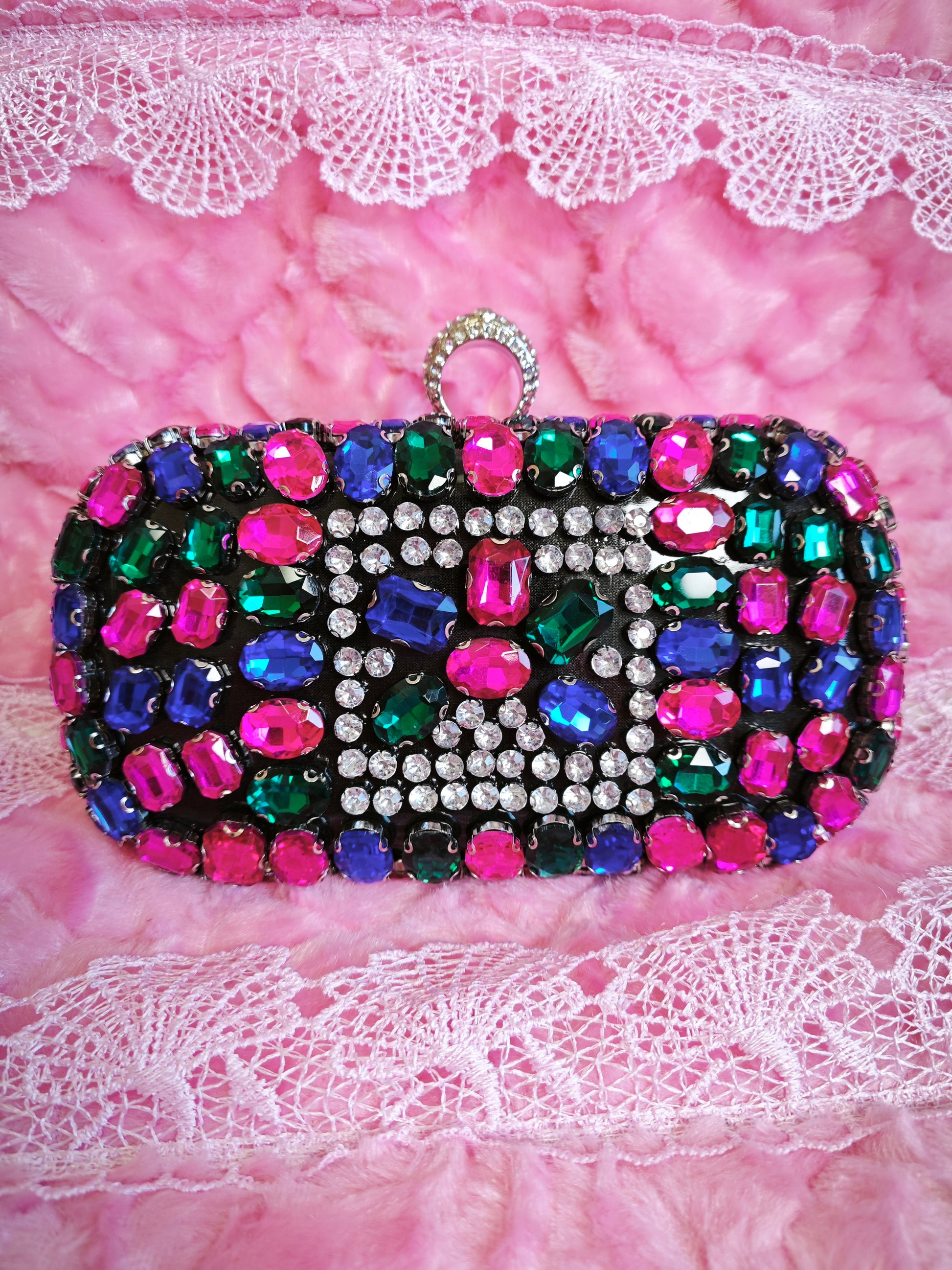 It features a classic rectangular clutch bag silhouette (neat and simple lines, three-dimensional and slender outline), highlighted by "full diamond inlay + black matte fabric + diamond ball crystal hardware buckle". The combination of "colorful diamond geometric splicing + black matte base" creates a "colorful light luxury dinner style" with strong colored diamond luster and cool black base texture. The rectangular bag has an "eye-catching atmosphere filter", and the clutch bag shape is suitable for banquets, parties, annual meetings and other formal style scenarios, making it a "luxurious highlight" for outfits.