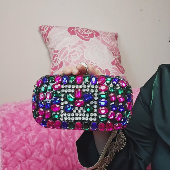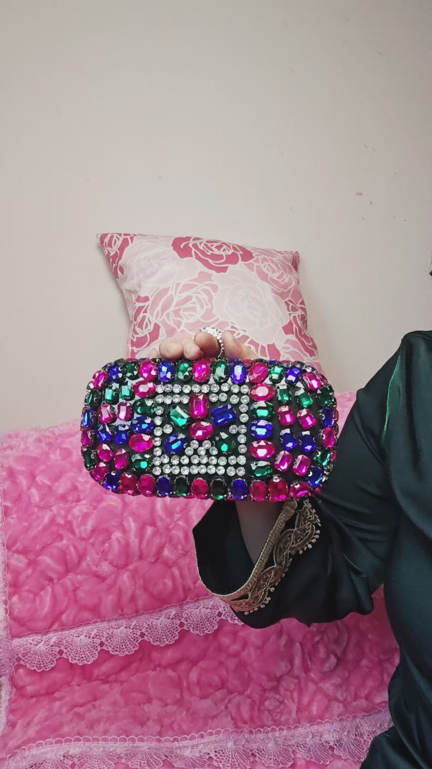 Crafted with high-quality colorful diamond dense setting + silver-white crushed diamond splicing technology and delicate black matte fabric, the front features a gorgeous and eye-catching visual effect with full-paved rose red, sapphire blue, emerald irregular diamonds + silver-white crushed diamond geometric splicing technology. The side is made of black matte textured fabric (smooth touch with low-key frosted texture), and the metal edging adopts electroplated bright silver technology for anti-oxidation and non-fading. The rhinestones are inlaid with firm handcraft, not easy to fall off. The matte fabric has both scratch-resistant and wear-resistant properties, which not only retains the luxurious and shiny texture of the clutch bag, but also can maintain a delicate shape for a long time in daily use.