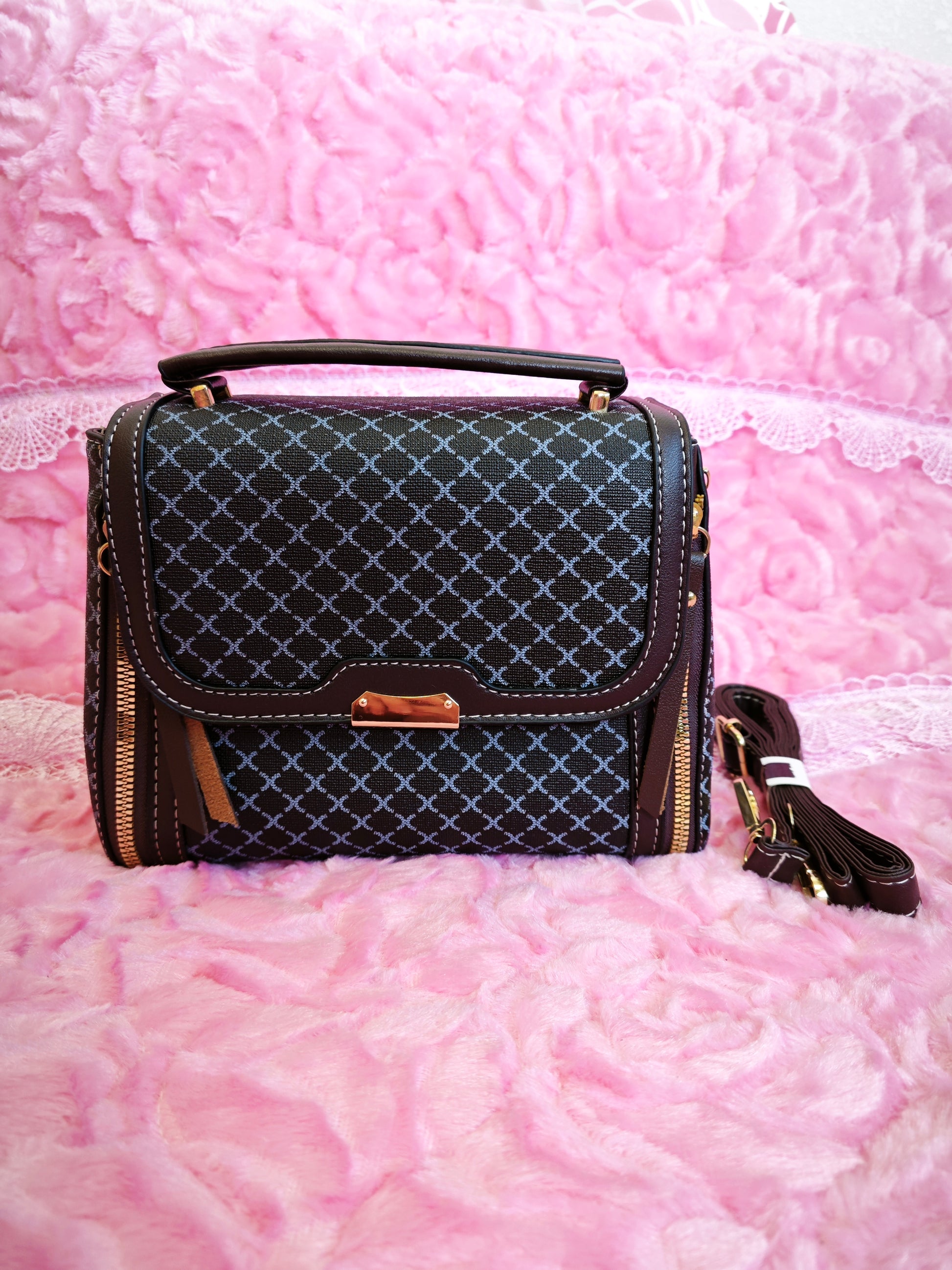 Classic handbag silhouette (neat and generous lines), paired with "rhombus grid jacquard + matte leather" splicing as accents—it combines "jet-black base + rhombus grid texture + metal lock"; the calm black tone and retro check details collide to create a "classic light luxury commuter vibe"; the black grid bag body comes with a "versatile high-end filter," suiting workplace, daily and other style scenarios as a "classic texture anchor" for outfits.