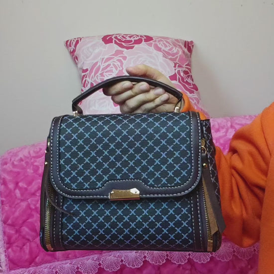 Black-Blue Checkered & Brown Trim Handbag with Metal Buckle
